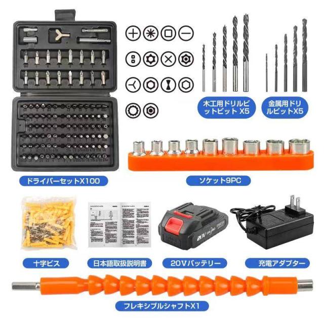 【豊富な付属品】5*金属用ドリルビット、5*木材用ドリルビット、9*ソケット、100*ビットセット、50*M6ボルト、1*フレキシブルシャフト(角度を最大360度まで自由に調整可能)。専用ケースも付きで、作業後も付属品を楽々に収納でき、置く場所も困らなく省スペースです。