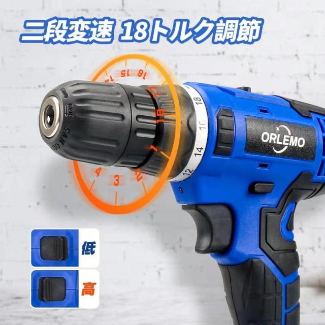 【コードレス電動ドライバー】本電動ドリルは最大トルクは35Nmです。18段階トルク(締め付けの強さと穴あけ)あり、作業に合わせて自由にトルクを調整します。適した作業を行えるようになっています。回転速度を高(0~1500rpm)・低(0~400rpm)2段階で調節する事ができます。トリガースイッチを押す力により無段変速が行え、回転速度も調整できます。