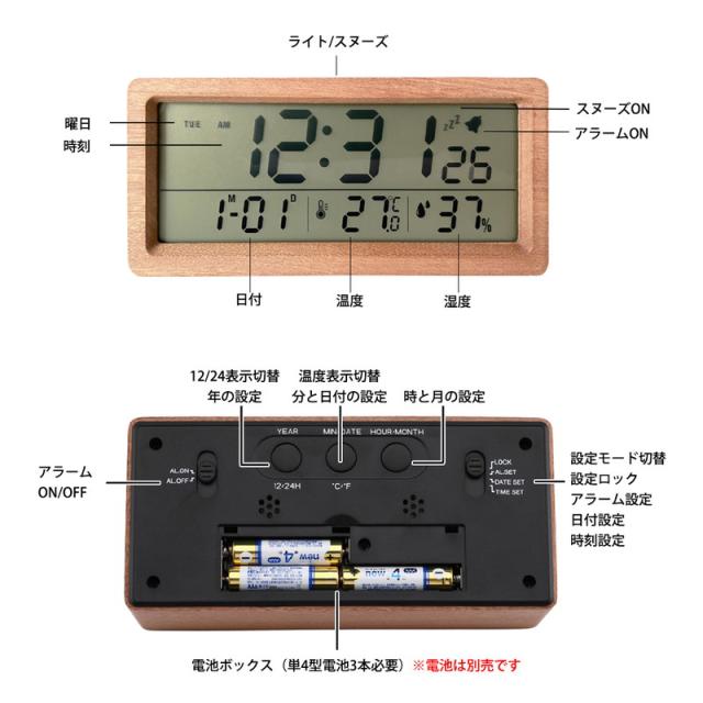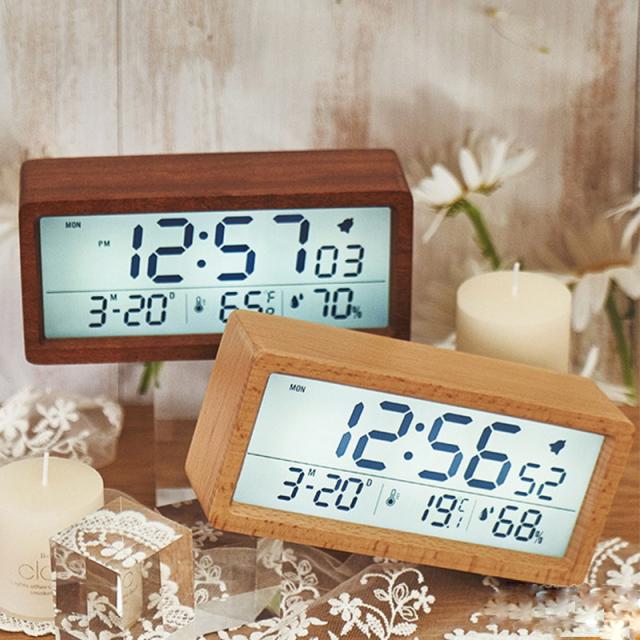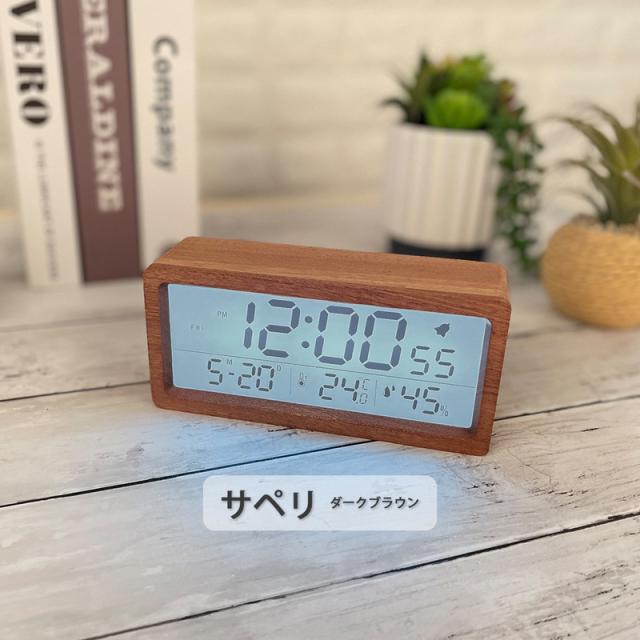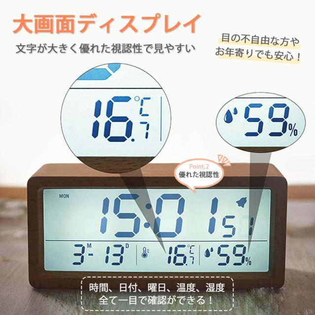 大画面液晶と木製フレームが特徴のデジタル目覚まし時計です