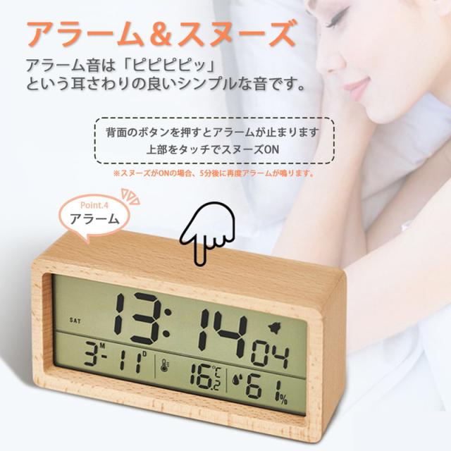 機能:時間表示、日付表示、温度表示、湿度表示、アラーム、スヌーズ、表示切替、タッチ式