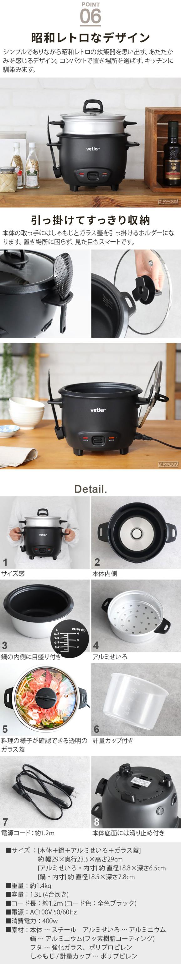 | フタ:ガラス、ポリプロピレン 本体:スチール アルミせいろ:アルミニウム 鍋:アルミニウム(フッ素樹脂コーティング) しゃもじ、計量カップ:ポリプロピレン |