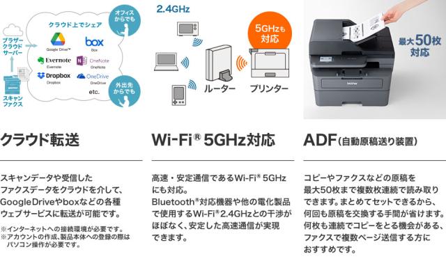 無線LAN対応、ADF、ファクス機能を搭載したモノクロレーザー複合機。