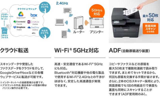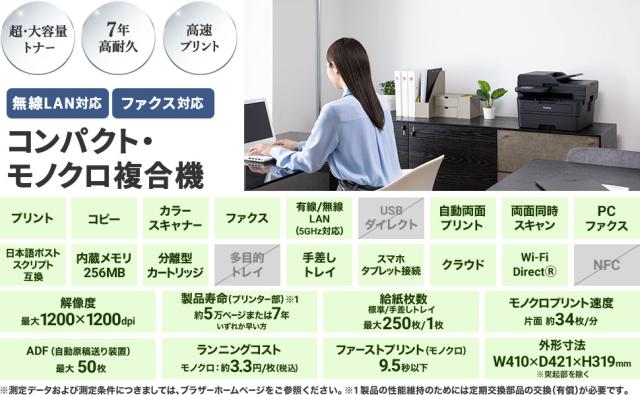 無線LAN対応、両面同時スキャン対応、ADF、ファクス機能を搭載したモノクロレーザー複合機。