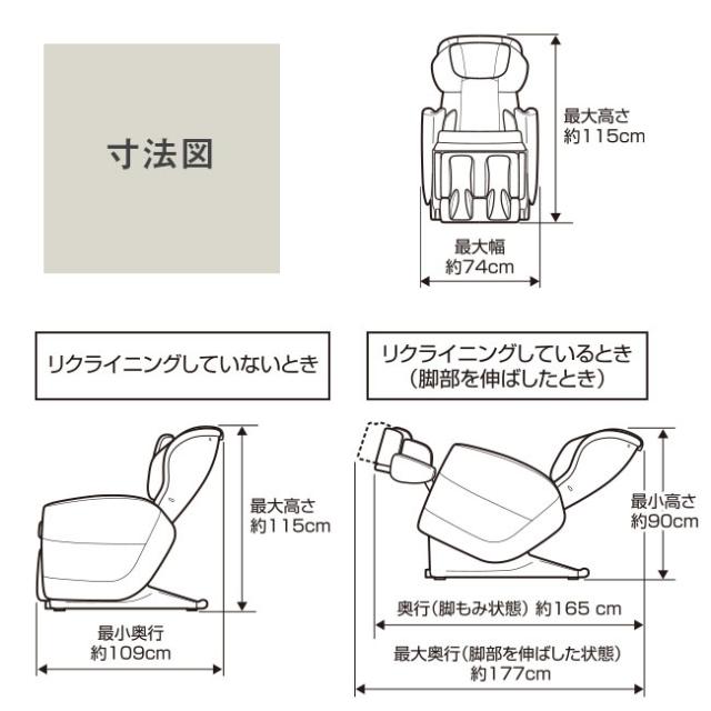 ●サイズ(約)/通常時:幅74×奥109×高115cm、リクライニング時(脚部最大時):幅74×奥177×高90cm