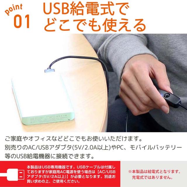 ●USB給電式なので、ご自宅やオフィスはもちろん、車内でも使えます。(※USB-ACアダプター、USB用シガーソケット、モバイルバッテリー等は付属しておりません。)