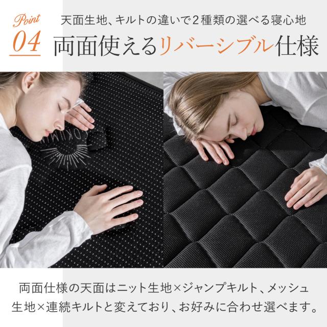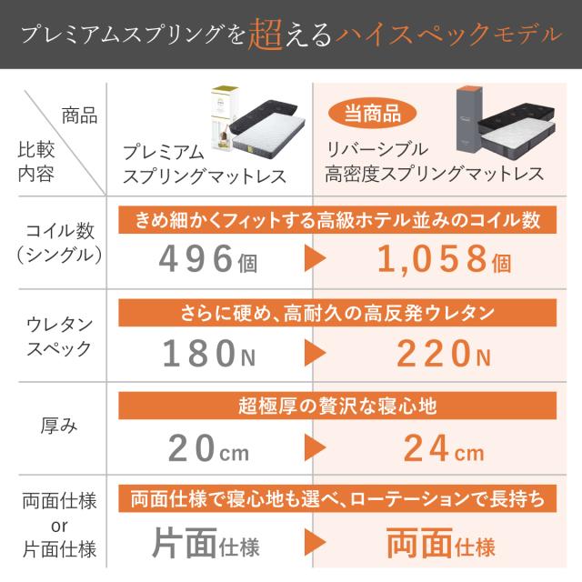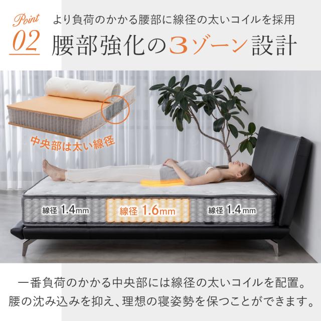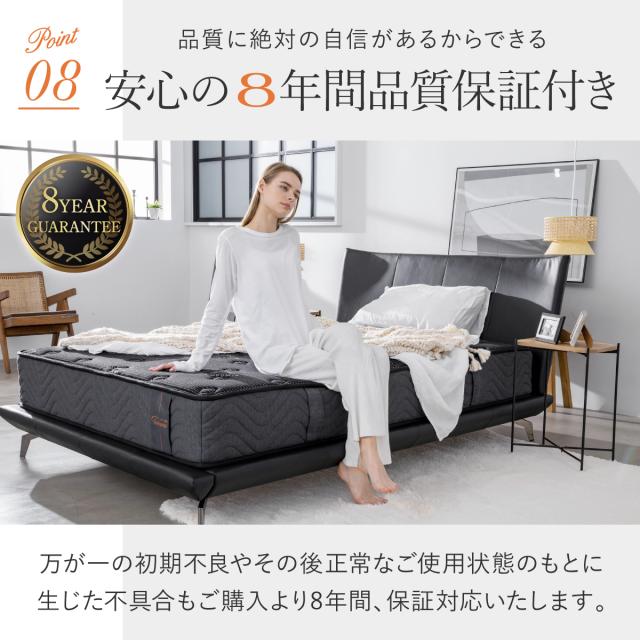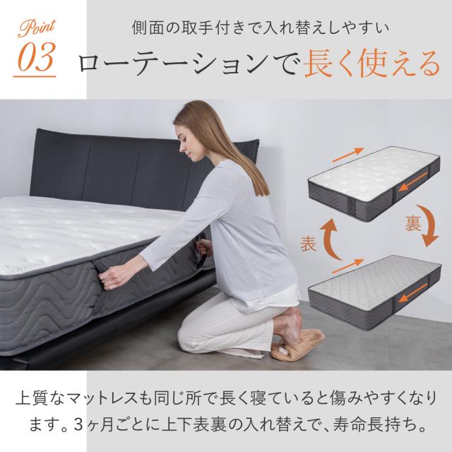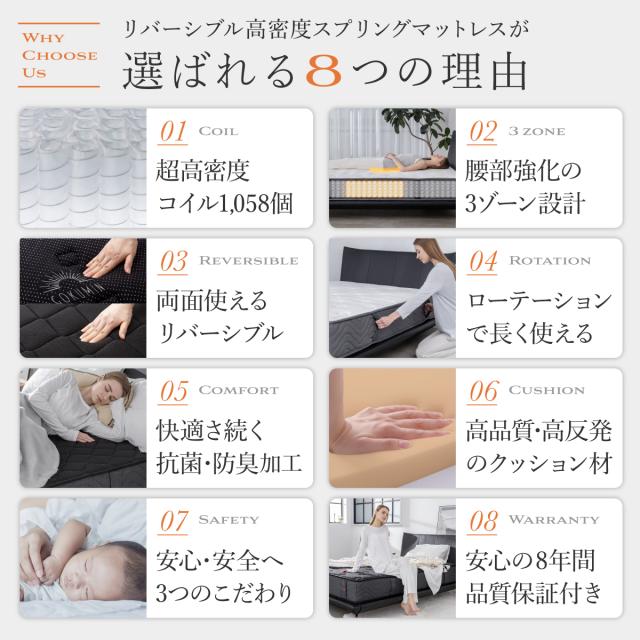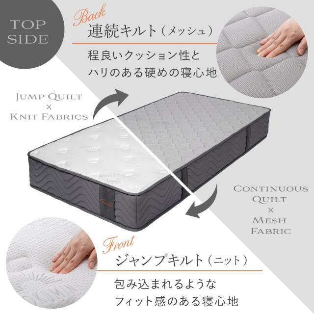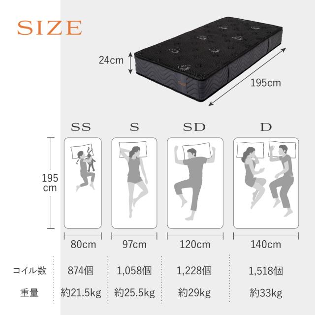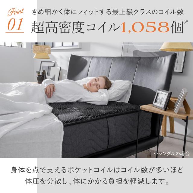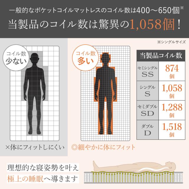 【最上級クラスのコイル数,超高密度コイル 1,058個】コイル数は驚異の1,058個!細やかに体にフィットし、理想的な寝姿勢を叶えます。身体を点で支えるポケットコイルマットレスはコイル数が多いほど体圧を分散し、体にかかる負担を軽減します。【贅沢な厚み極厚24cm,中央を強化した3ゾーン設計】コイルは高品質ポケットコイルを並行配列に配置し、一番負荷のかかる中央部には線径1.6mmのしっかりとした太めのコイルを採用。【高品質・高反発素材のクッション材】220N/32Dの高反発かつ高密度のクッション材を使用し、耐久性も抜群です。【両面使えるリバーシブル仕様で2倍長持ち】天面はニット生地のジャンプキルト面、メッシュ生地の連続キルト面の両面仕様で、お好みに合わせてお選びいただけます。【ローテーションで長く使える】3ヶ月ごとに上下表裏の入れ替えをすることで寿命をより長持ちさせることが可能です。【快適さつづく抗菌・防臭加工低ホルムアルデヒド仕様】【安心の8年間品質保証付き】【商品詳細】サイズ:幅約97cm×奥行約195cm×高さ約24cm(外形寸法)重量:約25.5kg日本企業開発イタリアデザイン中国専用工場生産