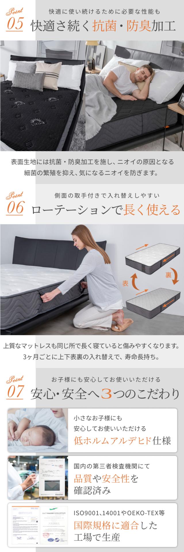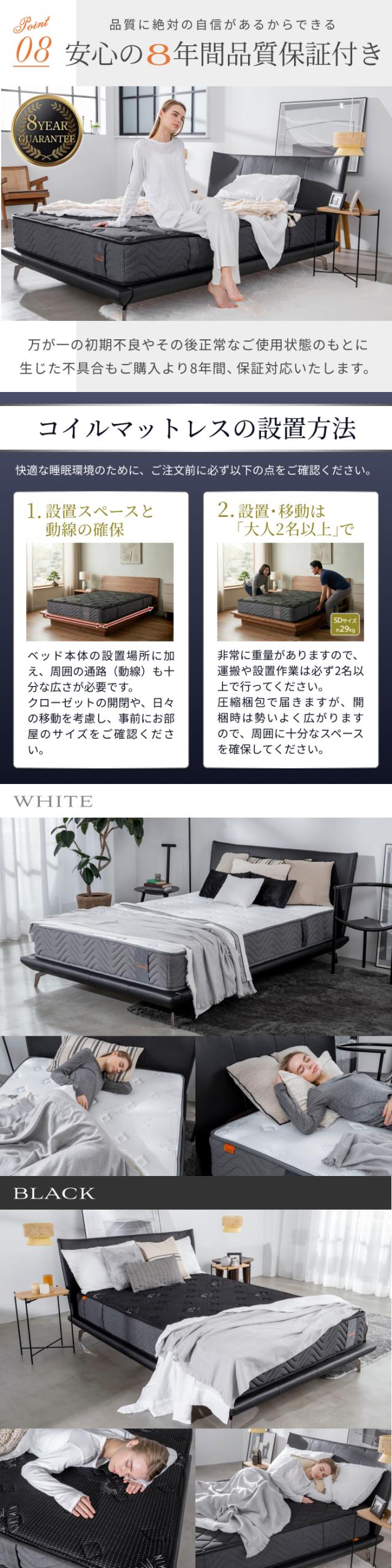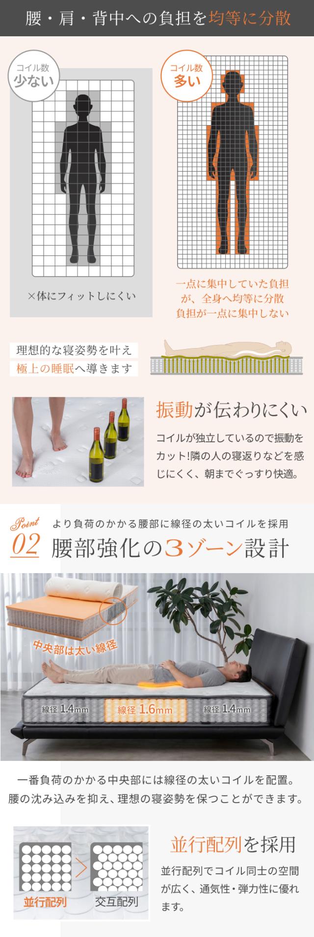 コイルは高品質ポケットコイルを並行配列に配置し、一番負荷のかかる中央部には線径1.6mmのしっかりとした太めのコイルを採用。