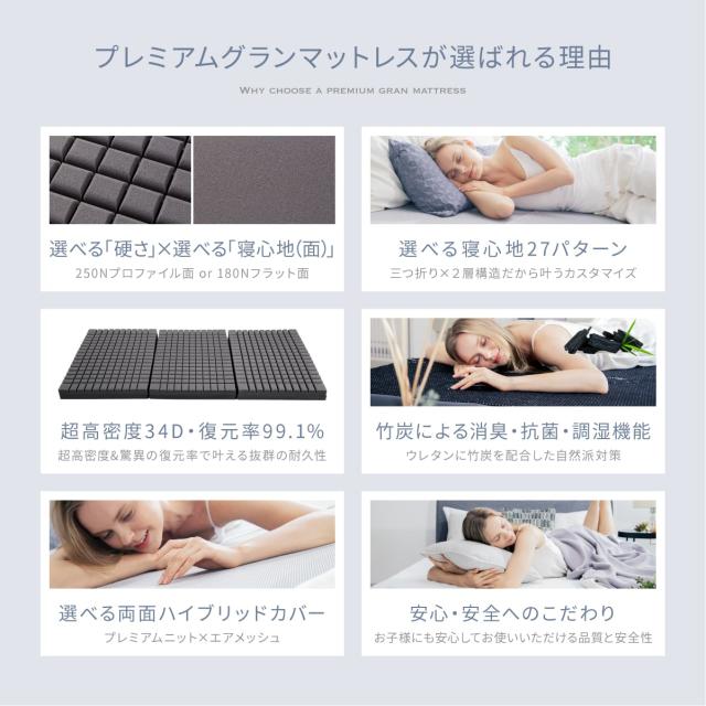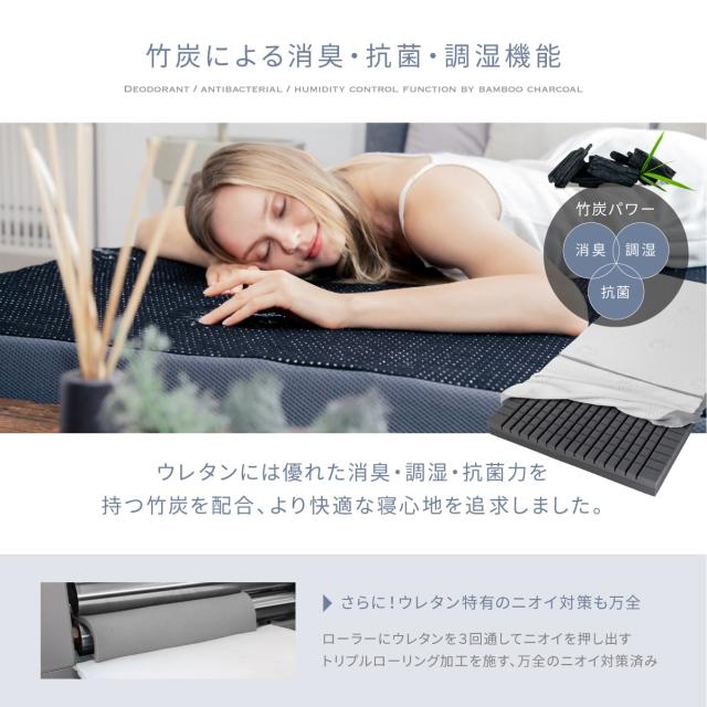 【10cmマットレスの決定版】「180Nと250Nの2層構造」×「リバーシブルカバー」×「特殊凸凹加工」×「竹炭消臭」×「34D高品質ウレタン」で27通りの寝心地が試せる夏も冬も安心の34D高品質マットレス。【1枚で6倍長持ち】2層構造と3つ折りとすることで、一番ヘタリやすい腰部を、頭部や足部と入れ替えご利用いただけます。結果6倍長持ち(他社比でも2倍長持ち)。 【こんな方におススメ】10cmの厚いマットレスが欲しい、凸凹形状も試してみたい、異なる硬さを試してみたい(180N/250N)。今使っている布団や感触は良いが、底付きしやすい低反発マットレスでは腰が痛くなる。疲れが取れないなどのお悩みの方に最適な商品です。