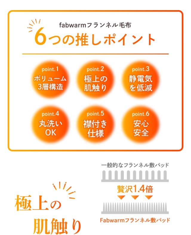 【吸湿発熱 fab warm +2.5度】人が寝ている間に出る汗や湿気を吸収し、熱に変換する吸湿発熱素材を、中綿と表面のフランネル生地に使用。【ヘムが気にならない襟付き仕様】徹底的に心地よい肌触り・使い心地を追求し顔や首元までマイクロフランネルの至福の柔らかさを体感できる作りにしました。【高綿密度でとろける肌ざわり】超極細マイクロフランネルを一般的なフランネル敷パッドの1.4倍の綿密度で仕立てた贅沢な一枚。【静電気を軽減】基布部分に静電性に優れた特殊レーヨン素材を採用。【極厚ふっくら2枚合わせ中綿入り】1.5cm吸湿発熱中綿入りの「ボリューム三層構造」でふっくら暖かな寝心地。【抗菌防臭、丸洗いOK】優れた抗菌防臭効果で細菌の増殖を抑制し、防臭効果を発揮。【1年中長く使える】春秋は毛布一枚で、冬は毛布に掛布団をプラスし、気温や気候に合わせて長くお使いいただけます。サイズ:シングルサイズ:約140×200cm表地、裏地:ポリエステル60%レーヨン40%中綿:ポリエステル100%(吸湿発熱綿/抗菌綿ブレンド)製品重量:約2.18kg化粧箱サイズ:20×20×40cm商品企画/開発:日本デザイン:イタリア生産国:中国専用工場