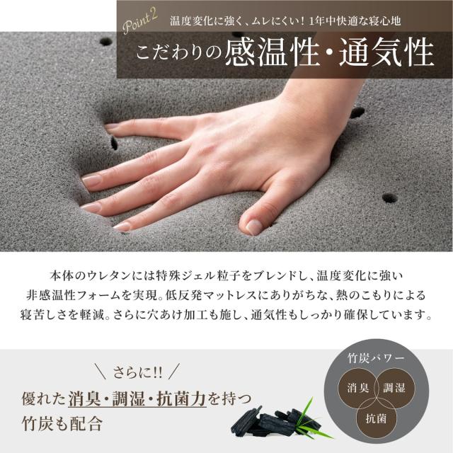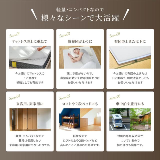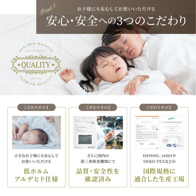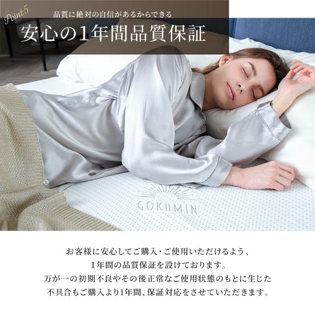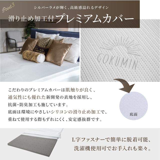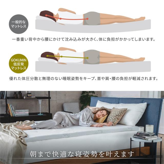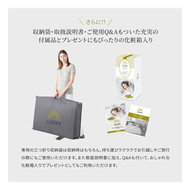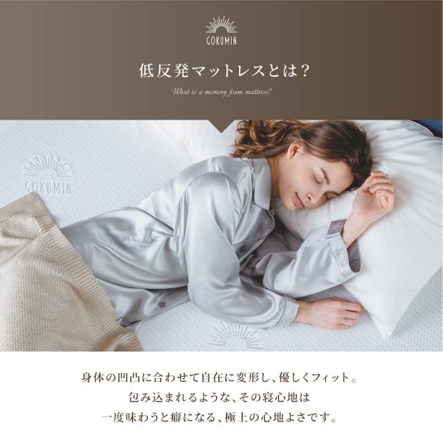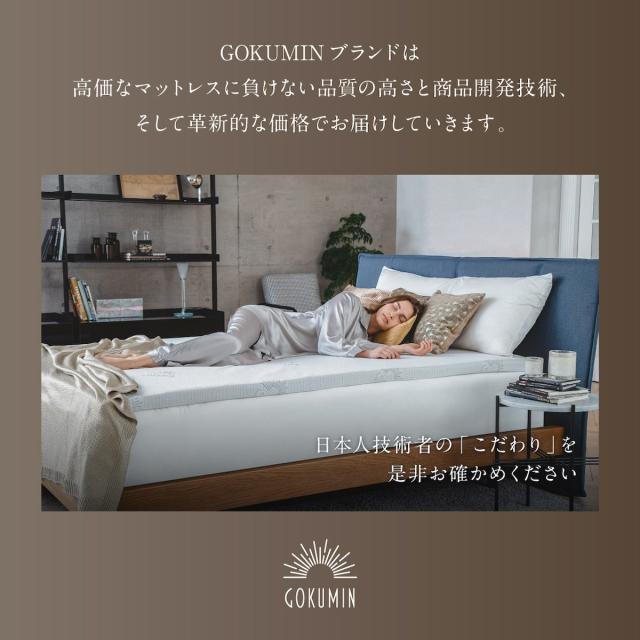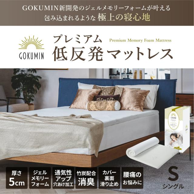 【史上最高!極上の寝心地】新開発低反発ジェルメモリー素材で、弾力性や復元力に優れ、体の凹凸に合わせて自在に変形します。極上のフィット感、よりバランスの良い体圧分散で腰痛の緩和に貢献します。【頭・腰・肩や背中への負担を軽減で爽快な朝】 高反発では固すぎる、低反発が好き。疲れが取れないなどのお悩みの方に最適な商品です。ベットや布団に+αがオススメです。【こだわりの感温性&通気性&消臭性】特殊ジェル粒子をブレンドし、温度変化に強い非感温性フォームを実現。夏でも冬でも快適です。通気性にもこだわり穴あき加工による更なる通気性を確保。さらに、竹炭による消臭までサポート【高級感あるカバー&2層構造】プレミアムの名にふさわしいラメ入り高級カバーを採用。フローリングでも滑りにくいノンスリップ加工はもちろん、2層構造やL字ファスナー、抗菌・消臭加工などこだわり抜いていいます【商品詳細】マットレス/付属カバー(洗濯可)/収納袋/日本語取扱説明書/よくあるご質問集/高級化粧箱、サイズ:幅97cm×奥行195cm×高さ5cm、重量:約4.5kg、【日本人技術者のこだわりをお確かめください】ゴクミン ごくみん