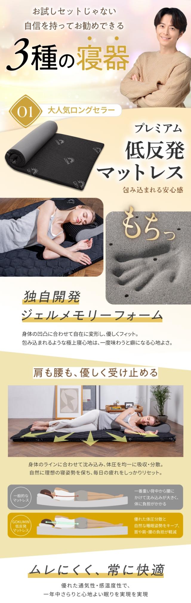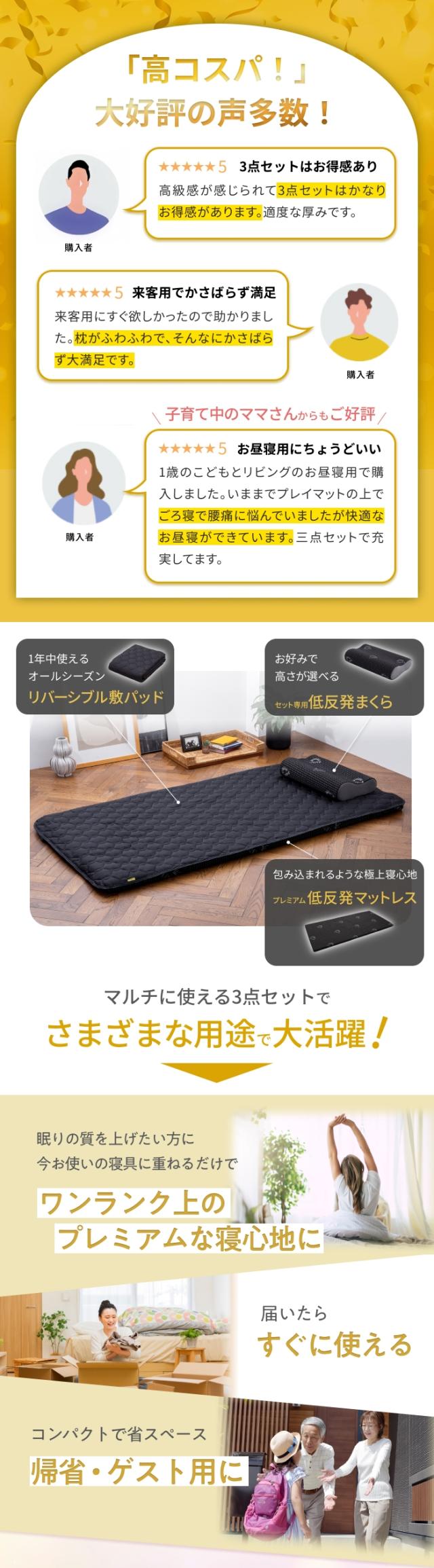 1.極上の寝心地「プレミアム低反発マットレス」、2.両面仕様で高さが選べる!フィット性抜群の「プレミアム低反発3点セット専用枕」、3.接触冷感面を含む両面使える「リバーシブル敷パッド」のお得な3点セットをご用意しました。