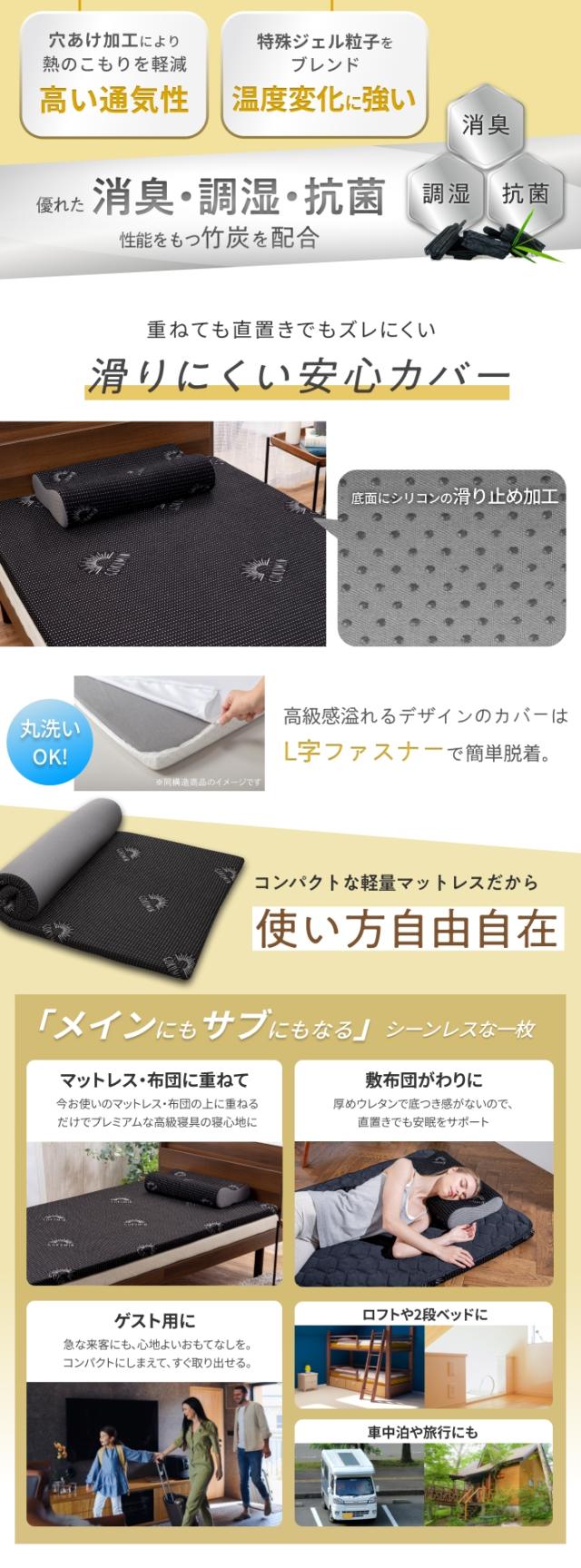 一般的なマットレスとはウレタンが異なる、独自開発の「ジェルメモリーフォーム」を採用。【軽量で移動が簡単!使い方自由自在】プレミアム低反発マットレスは、今お使いのマットレスや敷布団に重ねて、寝心地改善に最適。