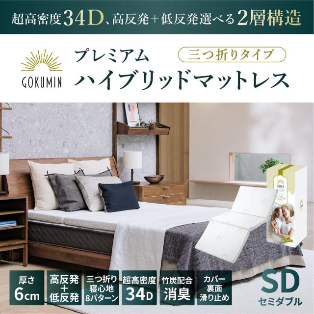 マットレス セミダブル(幅120×縦195×厚さ6cm) 三つ折り 高反発 低反発 敷布団 腰痛対策 収納 GOKUMIN 高品質34D 硬め180N