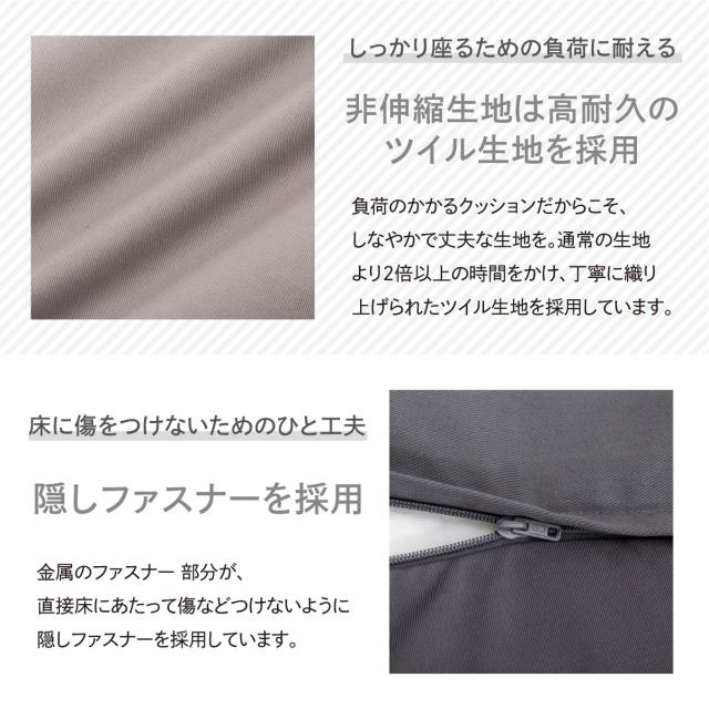 | 素材 | カバー生地:上下ニット生地:ポリエステル89%ポリウレタン11%、四周生地:綿35%ポリエステル65%(撥水加工) 本体生地:ポリエステル89%ポリウレタン11%(撥水加工) 中材:ポリエチレンビーズ1mm(静電気防止加工) |