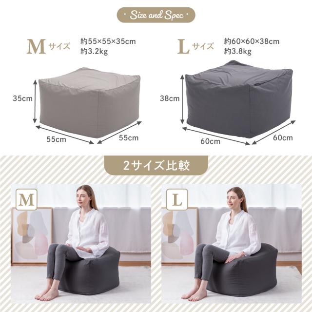 | サイズ・重量 | 商品サイズ:Lサイズ60x60x38cm 梱包サイズ:Lサイズ63×54×43cm 商品重量:製品重量3.8kg、ビーズ重量3.2kg |