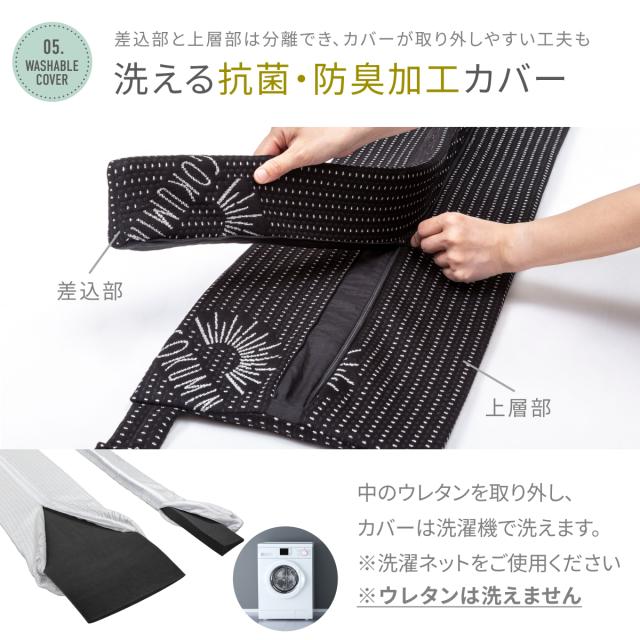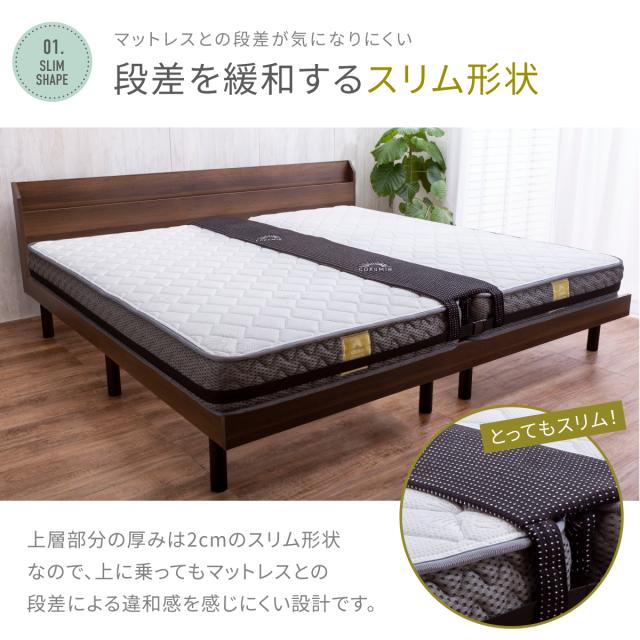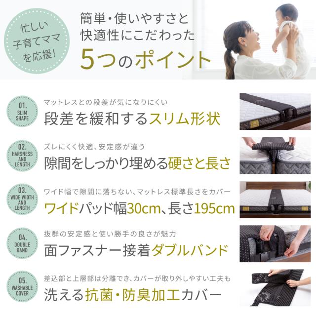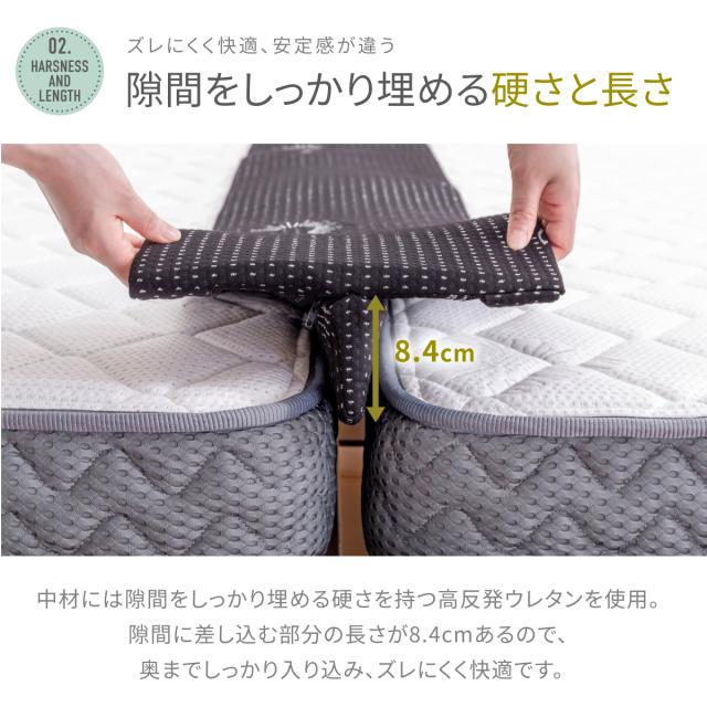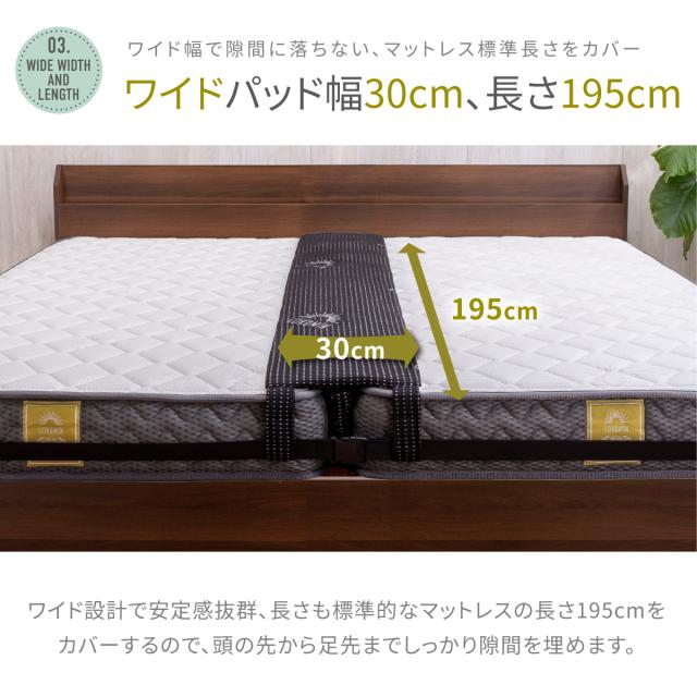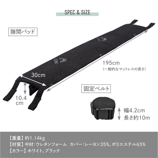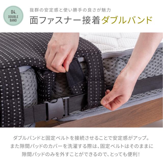 【段差を緩和するスリム&ワイド設計】パッド上層部分の厚みは2cmのスリム形状、上に乗ってもマットレスとの段差による違和感を感じにくい設計。【隙間をしっかり埋める硬さと長さ】隙間に差し込む部分の長さが8.4cm、奥までしっかり入り込み、 ズレにくく快適。【安定感抜群の固定ベルト+ダブルバンド仕様】長さ10m、 幅4.2cmの固定ベルトにはバックルとアジャスター付き固定ベルトと面ファスナー接着のダブルバンドとを接続させることで安定感がアップしました。【パッドだけ外せるので、カバーの洗濯時に便利!】お洗濯の際は中のウレタンを取り外し、カバーのみ洗濯機で洗ってください。【抗菌・防臭カバー・低ホルムアルデヒド仕様】カバー生地には抗菌・防臭加工を施し、ニオイの原因となる細菌の繁殖を抑えます。【安心の1年間品質保証付き】万が一の初期不良やその後正常なご使用状態のもとに生じた不具合もご購入より1年間、保証対応。【商品詳細】●サイズ : (隙間パッド)幅約30cm×長さ195cm×高さ10.4cm、(固定ベルト)幅約4.2cm×長さ10m●製品重量 : 約1.14kg