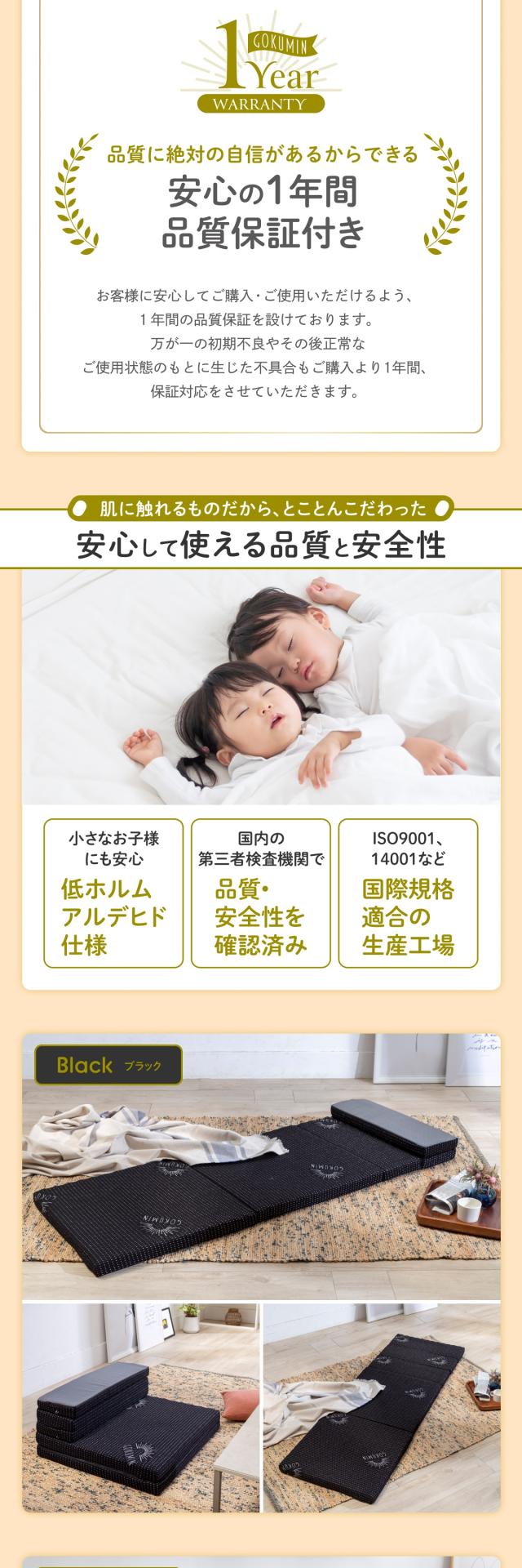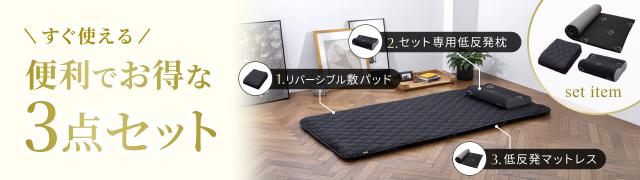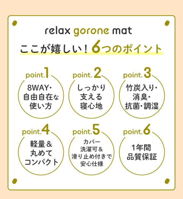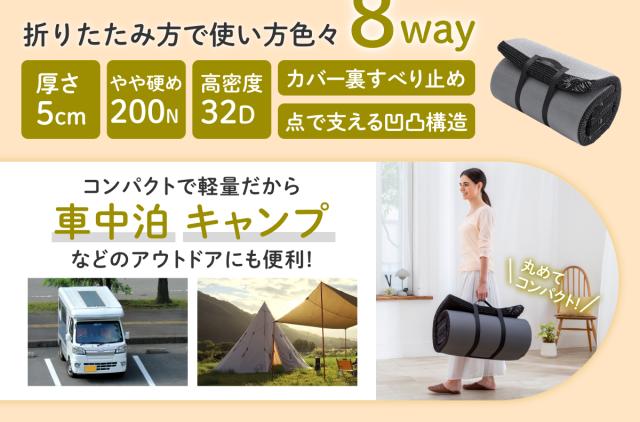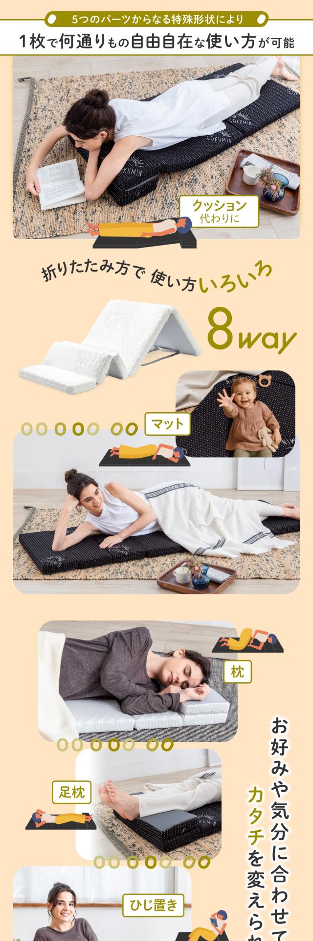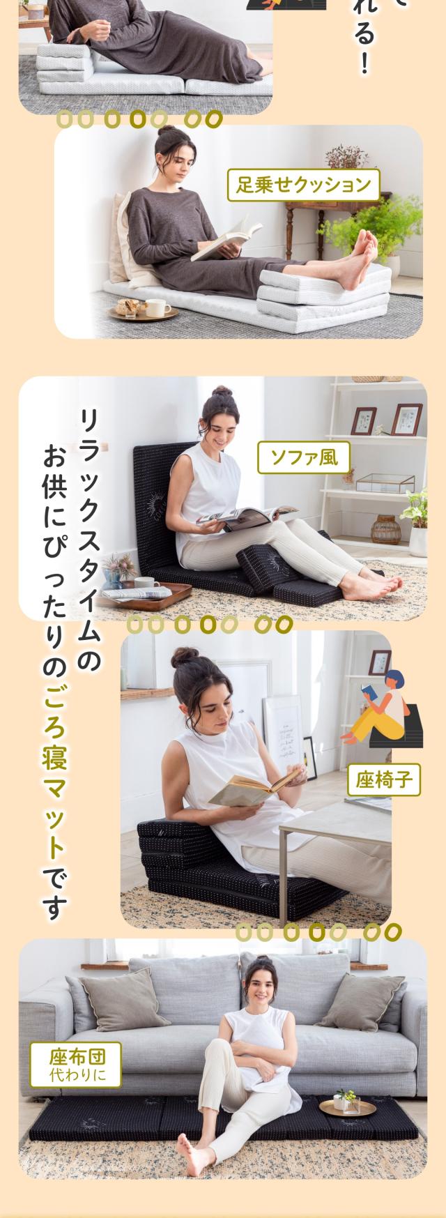使い方は無限大!? 1枚で何役もこなすリラックスタイムの必需品。全て広げてマットとしてはもちろん、ひとつ折った部分を”枕”や“足枕”に。小さいパーツ3つを折り重ねてクッション代わりやひじ置きに。【 極上の寝心地にこだわった高品質高反発ウレタン】点で体を支えるプロファイル加工を施した、やや硬め220Nの高反発ウレタン。【竹炭による 消臭・抗菌・調湿機能】中材のウレタンには優れた消臭・調湿・抗菌力を持つと言われる竹炭を配合し、より快適な寝心地を追求。【カバー底面に施した滑り止め加工】カバー底面には環境にも優しいシリコンによる滑り止め加工。【くるっと丸めて コンパクト収納】使わない時は、くるっと丸めてコンパクトに。収納場所に困りません。取っ手もついているので持ち運びにも便利。車中泊やキャンプなどのアウトドアにも。サイズ : 60cm×180cm×5cm丸めた収納サイズ:直径約34cm、高さ60cm材質 : ウレタンフォームアウターカバー : 表生地/ポリエステル65%、レーヨン35%、裏生地/ポリエステル100%インナーカバー : ポリエステル100%製品重量 : 約2.4kg化粧箱サイズ : 26×26×63cm