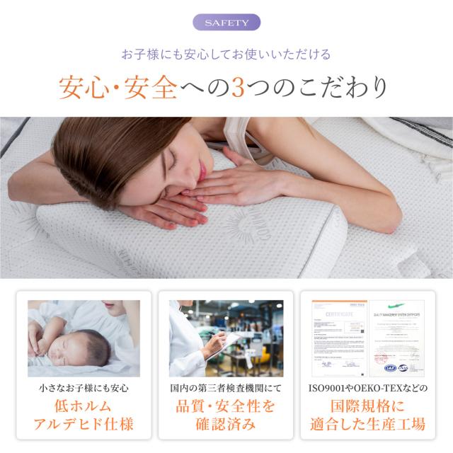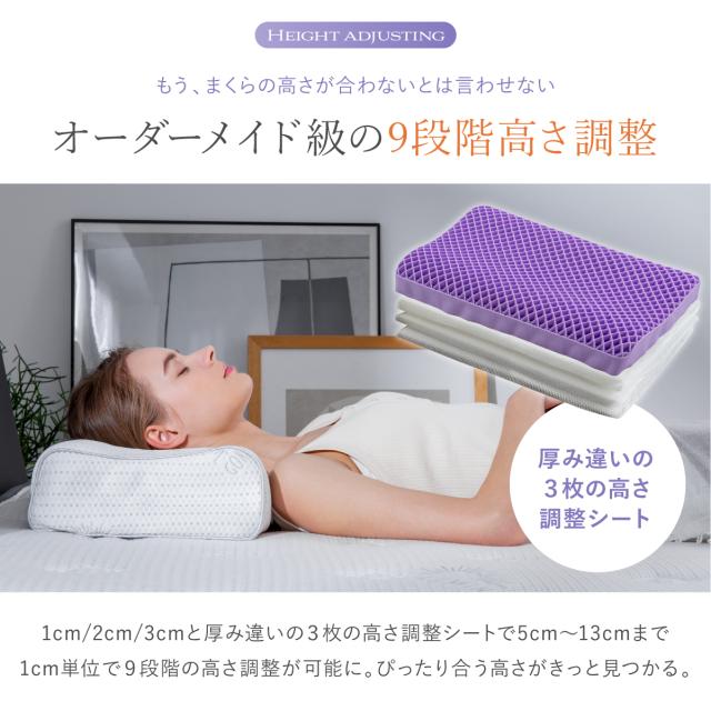 【極上の無重力寝心地を実現した、丸洗いも可能な高機能ジェル素材】本体は医療器具にも使用されるTPE (熱可塑性エラストマー) 素材を使用。【抜群の通気性と体圧を効果的に分散する特殊立体構造】人間工学に基づいて作られた特殊な格子構造は、頭部の形と位置に合わせて瞬時にフィット。 【オーダーメイド級の9段階高さ調整】1cm/2cm/3cmと厚み違いの3枚の高さ調整シートで7cm~13cmまで、1cm単位で9段階の高さ調整が可能に。【底面滑り止め加工付き・極上の肌触りの洗えるアウターカバー】洗濯機で簡単にお手入れ可能です。底面は滑り止め加工付きで睡眠中の枕のずれを防止し、安定した寝姿勢を保ちます。【快適さつづく抗菌・防臭加工低ホルムアルデヒド仕様】【安心の1年間品質保証付き】【商品仕様】枕/取扱説明書/高級化粧箱、製品サイズ:50cm×29cm×7-13cm(高さ調整可能)、製品重量:約2.3kg、材質:本体/熱可塑性エラストマー、高さ調整シート/ウレタンフォーム側生地:表生地/ポリエステル65%、レーヨン35%、裏生地/ポリエステル100%(滑り止め加工)、インナーカバー/ポリエステル100%、商品企画・開発:日本、デザイン:イタリア、生産国:中国専用工場
