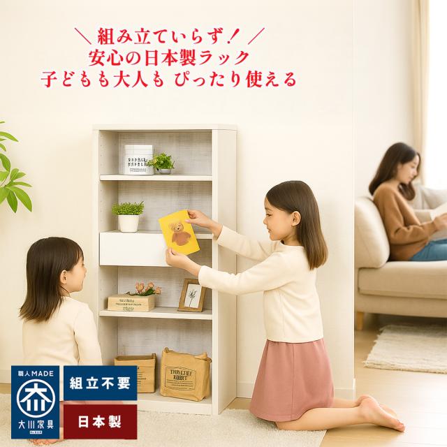 組み立ていらずの完成品。 届いてすぐ、家族の暮らしになじむ日本製ラック。 子どもも大人も、安心して毎日使えるオープンタイプの本棚・収納です。 |