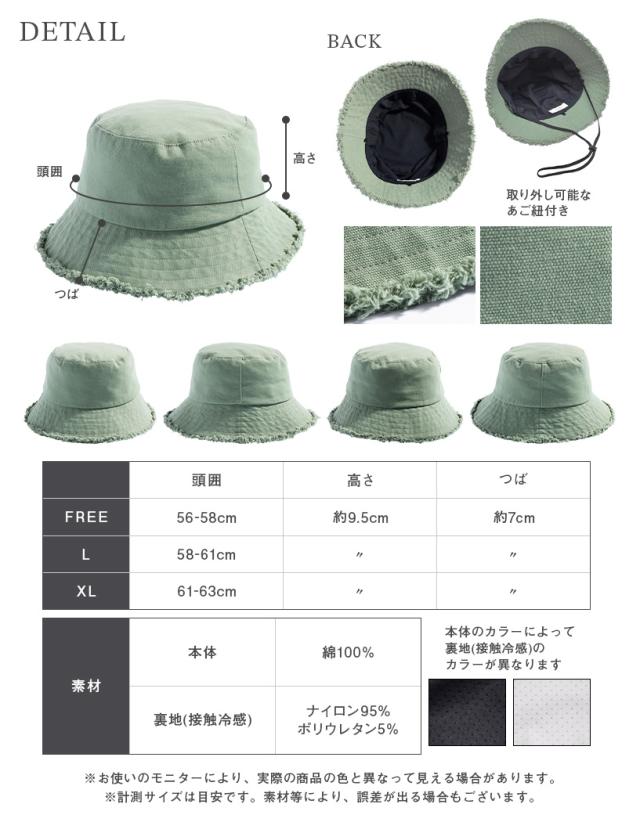| ・高さはモデル着用時の高さを記載しています。 ・頭囲・高さ・つばのサイズ表記は、5ミリ前後の誤差が生じる場合があります。計測サイズは目安としてお考えください。 ・お取り扱いの前に品質ネームタグの記載をご確認ください。 ・ご覧頂くモニターの発色具合によって実物と色が異なって見える場合があります。 ・単品商品の撮影画像が実際の商品と色合いが近くなっていますので、ご参照ください。 ・同商品でも、染色過程で色味が多少変わる場合があります。 ・マジックテープでのサイズ調整可能 ・取り外し可能なあご紐付き |