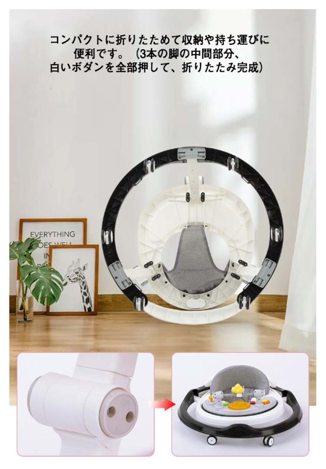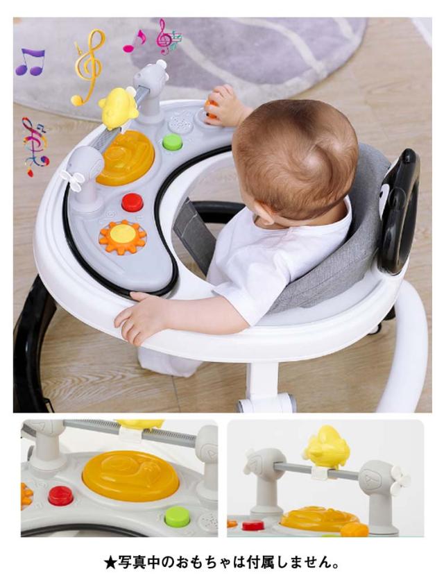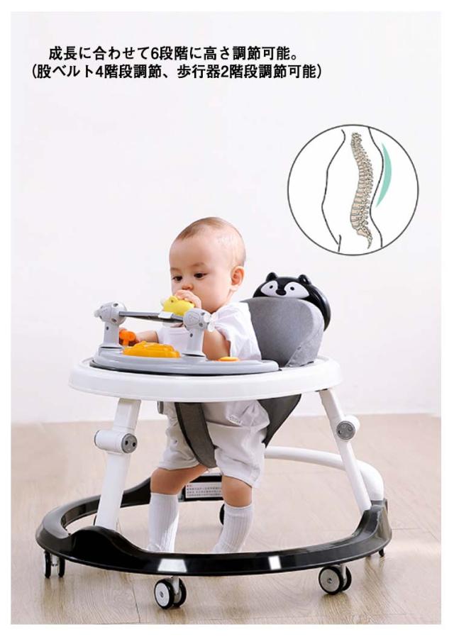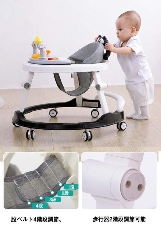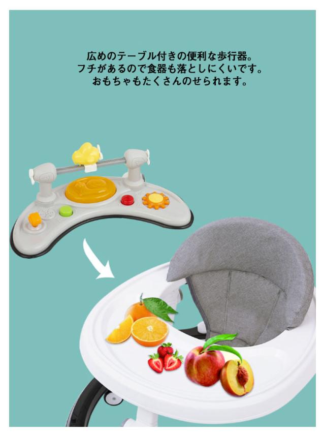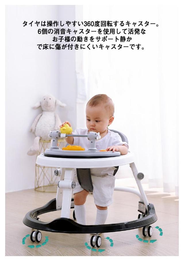 | 1台で2役、ウォーカー・手押し車として使用できます。6階段高さ調整可能。簡単に折りたためて収納できます。 タイヤは操作しやすい360度回転するキャスター。 6個の消音キャスターを使用して活発なお子様の動きをサポート静かで床に傷が付きにくいキャスターです。 成長に合わせて6段階に高さ調節可能。(股ベルト4階段調節、歩行器2階段調節可能) 広めのテーブル付きの便利な歩行器。フチがあるので食器も落としにくいです。おもちゃもたくさんのせられます。 コンパクトに折りたためて収納や持ち運びに便利です。(3本の脚の中間部分、白いボダンを全部押して、折りたたみ完成) つかまり立ちができるようになったら、手押し車で一人歩きをサポート。 ★写真中のおもちゃは付属しません。 | |