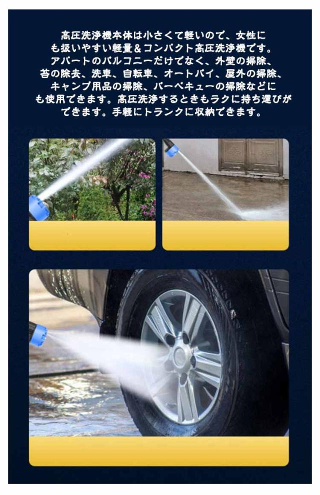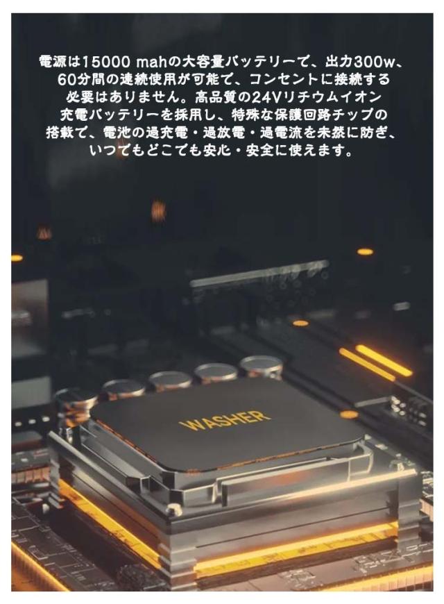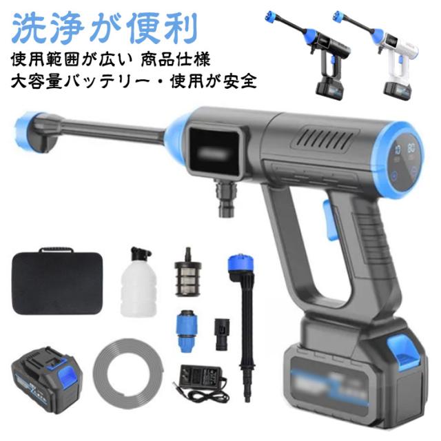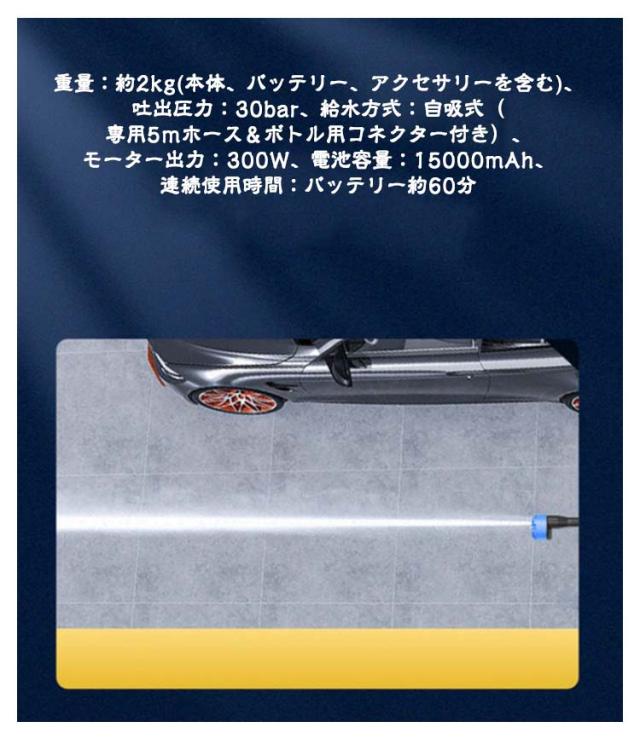 | 【商品仕様】 重量:約2kg(本体、バッテリー、アクセサリーを含む)、吐出圧力:30bar、給水方式:自吸式(専用5mホース&ボトル用コネクター付き)、モーター出力:300W、電池容量:15000mAh、連続使用時間:バッテリー約60分 【洗浄が便利】6種類出水モードがあります。1つのノズルだけで6種類の噴射モードを使用できます。さまざまな作業に対応でき、環境に応じた洗浄方法を選択できます。スタイリッシュなデザインと手軽さを兼ね備えたモバイル高圧洗浄ガンには延長ノズルと可動式ノズルがついていきす。50度までの温水が使えます。 【使用範囲が広い】高圧洗浄機本体は小さくて軽いので、女性にも扱いやすい軽量&コンパクト高圧洗浄機です。アパートのバルコニーだけでなく、外壁の掃除、苔の除去、洗車、自転車、オートバイ、屋外の掃除、キャンプ用品の掃除、バーベキューの掃除などにも使用できます。高圧洗浄するときもラクに持ち運びができます。手軽にトランクに収納できます。 【大容量バッテリー・使用が安全】電源は15000 mahの大容量バッテリーで、出力300w、60分間の連続使用が可能で、コンセントに接続する必要はありません。高品質の24Vリチウムイオン充電バッテリーを採用し、特殊な保護回路チップの搭載で、電池の過充電・過放電・過電流を未然に防ぎ、いつでもどこでも安心・安全に使えます。 | |