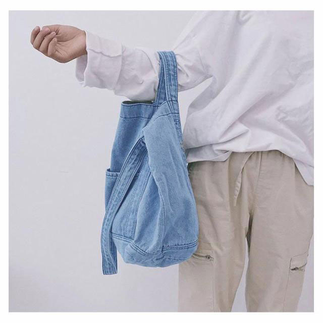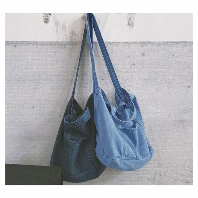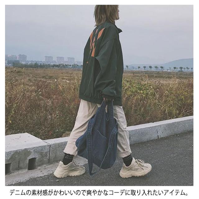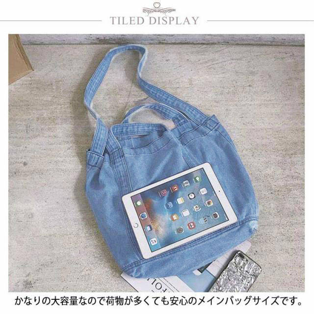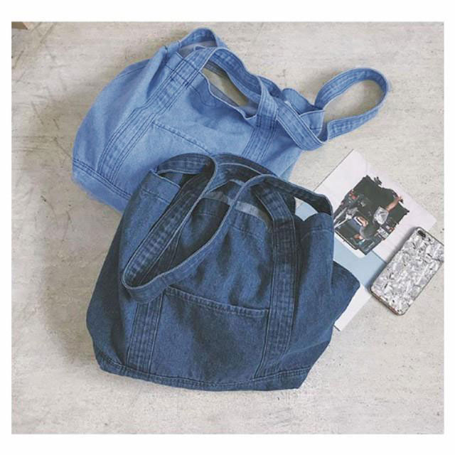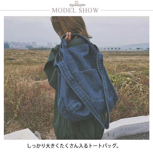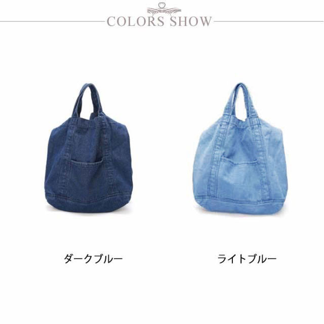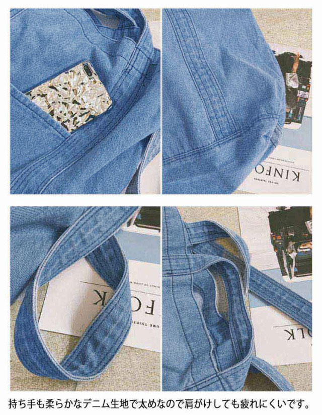 | 大容量が嬉しいデニムトートバッグ しっかり大きくたくさん入るトートバッグ。 デニムの素材感がかわいいので爽やかなコーデに取り入れたいアイテム。 持ち手も柔らかなデニム生地で太めなので肩がけしても疲れにくいです。 かなりの大容量なので荷物が多くても安心のメインバッグサイズです。 | |