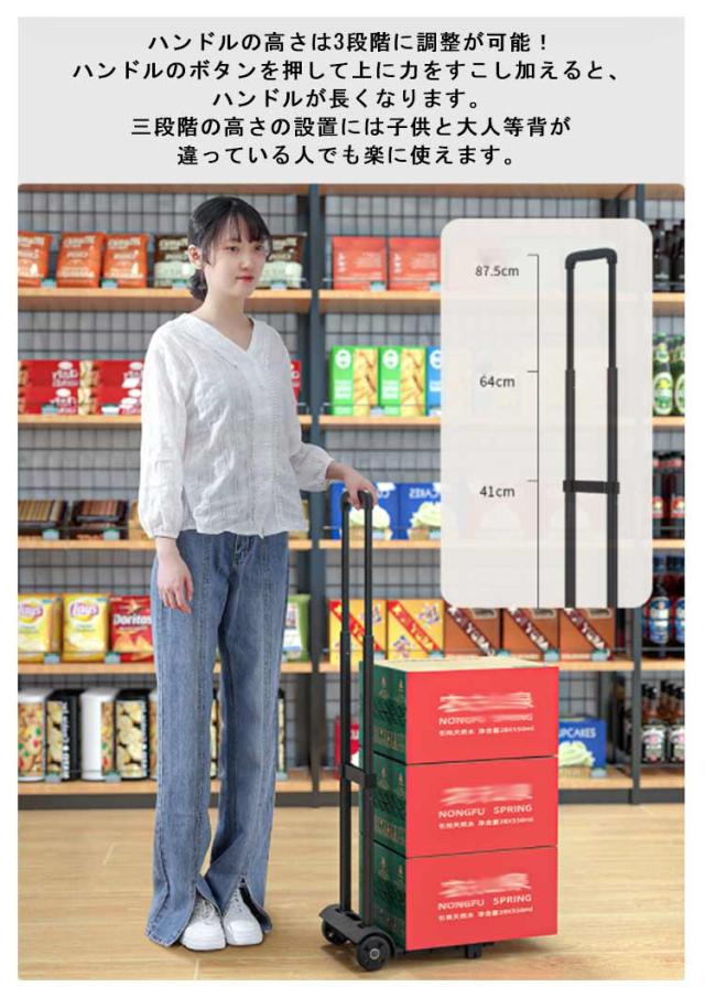 | 様々なシーンで使える軽量台車です。折りたためば平台車としても使用可能! いろいろ荷物をラクに運べる、様々なシーンで使える軽量台車★今まで重くて大変だった荷物の運搬がラクラクになります♪ ハンドルの高さは3段階に調整が可能!ハンドルのボタンを押して上に力をすこし加えると、ハンドルが長くなります。三段階の高さの設置には子供と大人等背が違っている人でも楽に使えます。 ゴムタイヤ採用で静音性もバッチリ! 使わないときは折りたたんでコンパクトに収納できます。畳んだサイズは小さいので、わざわざ保管場所を用意することがありません。女性でも楽に運べる程度の軽便な台車です。 事務運搬・家庭搬送・倉庫運び・ショッピング・旅行・レジャー・災害時などいろいろな場面で使えるので1つあれば非常に便利です。 | |