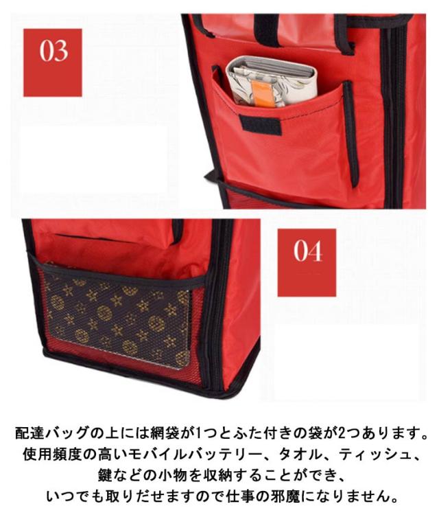 | 保温・保冷 、配達に最適なデリバリーバッグ。 外側に防水素材を使った、雨天、大雪などに外出するときも、安心して食べ物を配送できます。 内側の層にはアルミ箔で作られて、保温保冷効果がよく、飛沫や汚れを防ぎます。 仕切り板があり、暖かいものと冷たいものを仕分けて、パックの内部スペースをより有効使用できます。 断熱性の高い素材を使った宅配デリバリーリュックは、保冷性能が高いだけでなく、冬場の保温もできます。また、ファスナーがついていて、入り口が大きく開くので中身の出し入れが楽です。 配達バッグの上には網袋が1つとふた付きの袋が2つあります。使用頻度の高い、タオル、ティッシュ、鍵などの小物を収納することができ、いつでも取りだせますので仕事の邪魔になりません。 大容量バックパックには、寿司、刺身、飲み物、お弁当を収納するのに十分なスペースがあります。 軽量設計なので、男女問わずお使いいただけます。また折り畳み可能で収納やすくなる。 | |