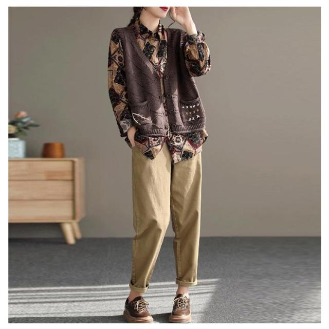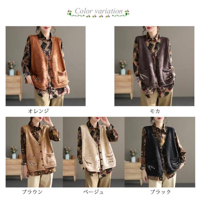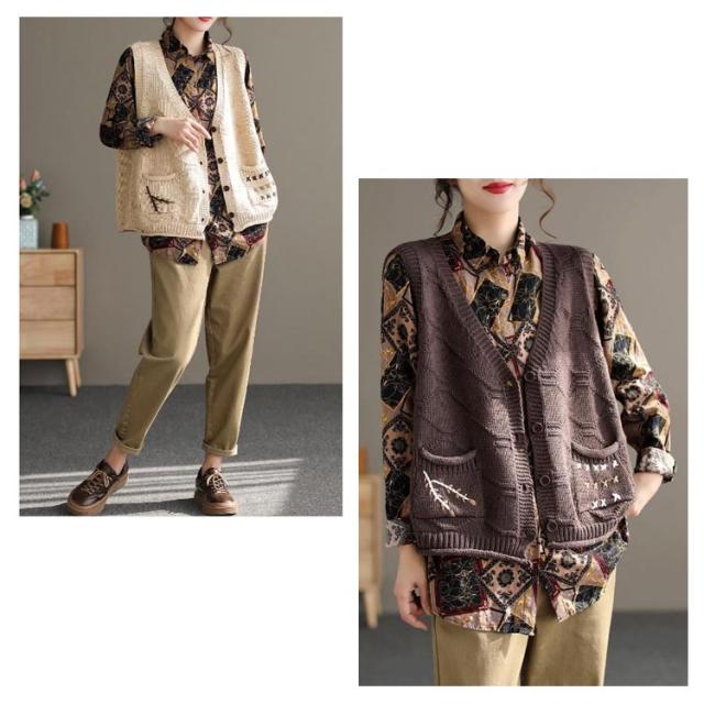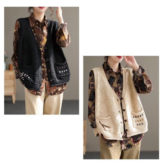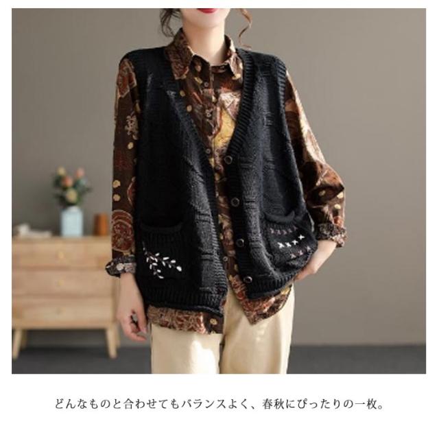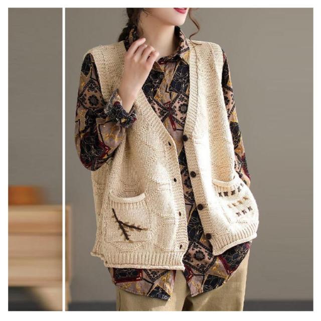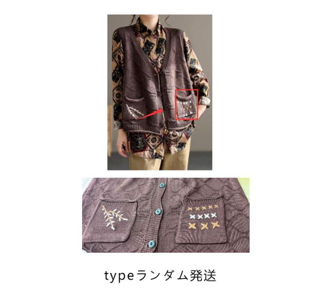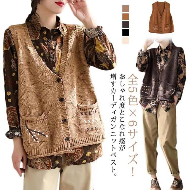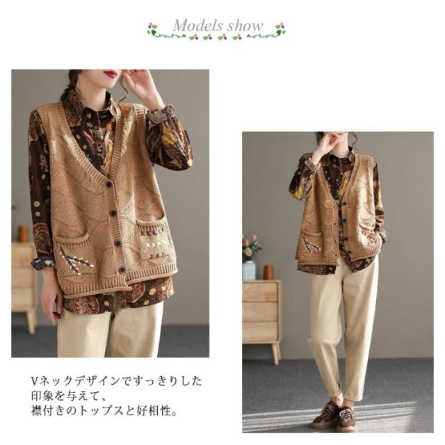 手芸刺?ポケット Vネック ニットカーディガン 送料無料 ベスト ニットベスト レディース カーディガンベスト 復古 文芸 ゆったり 上着 大きサイズ ナチュラル 森ガール シンプル 可愛い