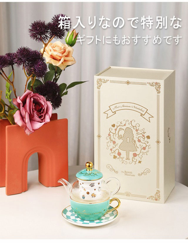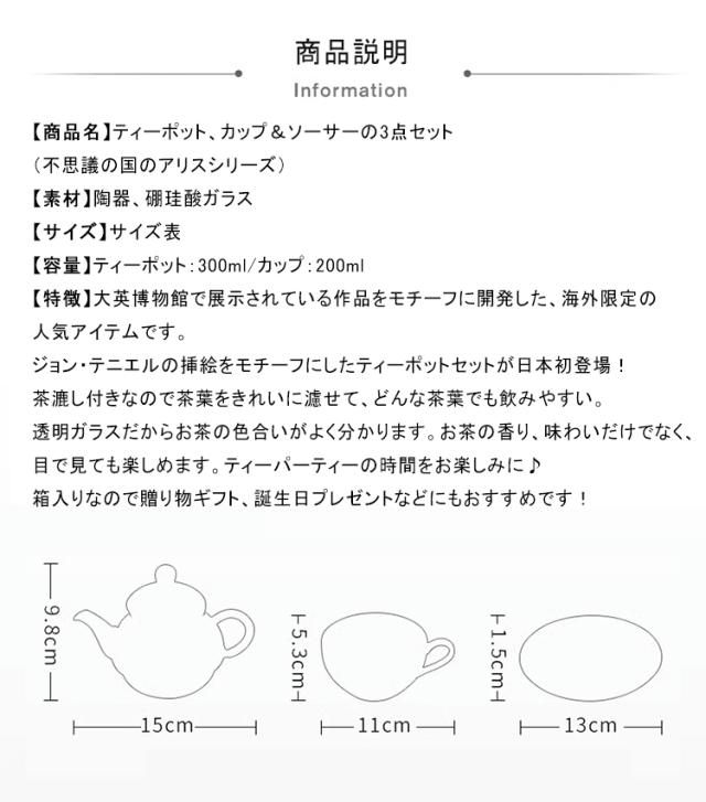 不思議の国のアリス ティーポット ティーカップ ソーサー 3点セット アリス チェシャ猫 茶漉し付き 茶こし付き ティーポット 耐熱ガラス 硼珪酸ガラス 陶器カップ コーヒーカップ お茶 カップ 新築祝い お誕生日 プレゼント 大英博物館 海外正規品 並行輸入品
