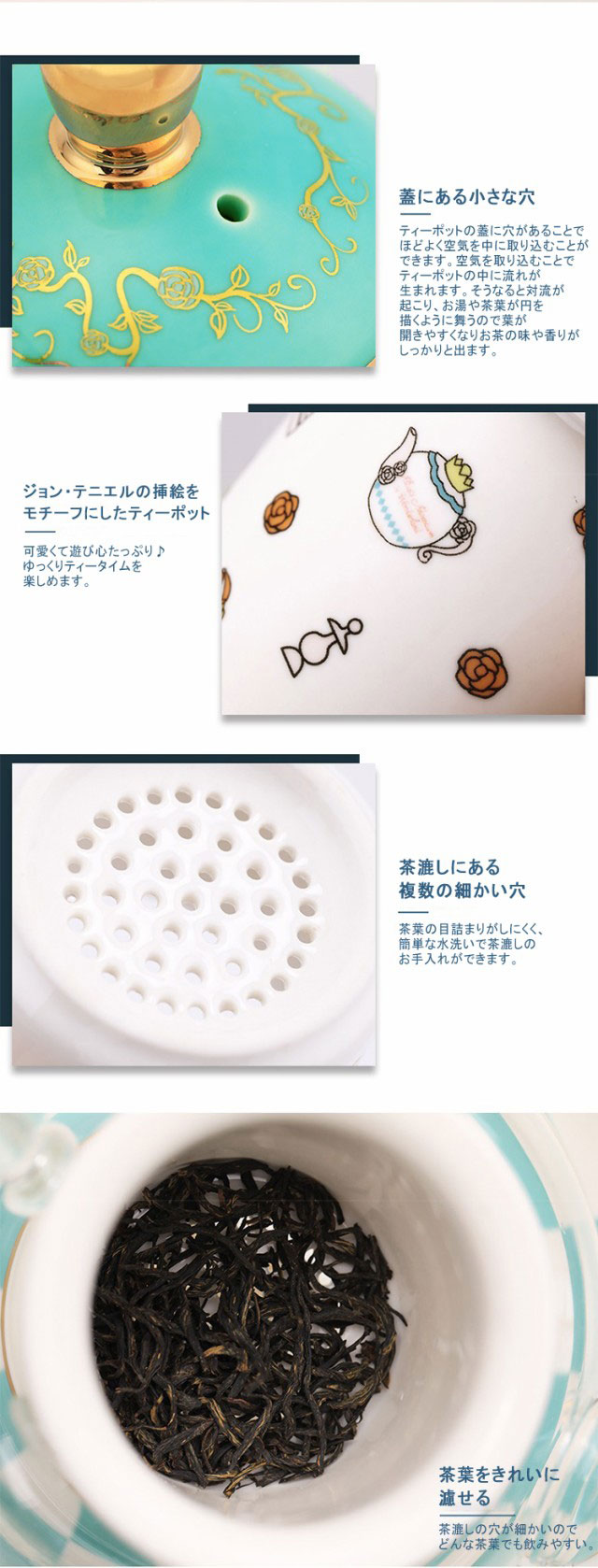 | 【商品名】ティーポット、カップ&ソーサーの3点セット(不思議の国のアリスシリーズ) 【素材】陶器、硼珪酸ガラス 【サイズ】サイズ表 【容量】ティーポット:300ml/カップ:200ml 【特徴】 大英博物館で展示されている作品をモチーフに開発した、海外限定の人気アイテムです。 ジョン・テニエルの挿絵をモチーフにしたティーポットセットが日本初登場! 茶漉し付きなので茶葉をきれいに濾せて、どんな茶葉でも飲みやすい。 透明ガラスだからお茶の色合いがよく分かります。お茶の香り、味わいだけでなく、目で見ても楽しめます。ティーパーティーの時間をお楽しみに♪ 箱入りなので贈り物ギフト、誕生日プレゼントなどにもおすすめです! | |