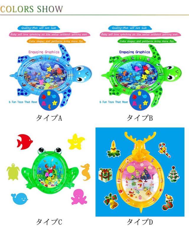 | 夏はひんやりして気持ち良いウォータープレイマットです 環境にやさしいPCV素材で、ぶつかっても痛くない角丸しようで、安全に遊べます。 カラフルなおもちゃが水中をぷかぷか浮かび、視覚や感触など五感をフルに刺激します。 安全に遊べるためうつ伏せで遊んだし、泳ぐ練習、お風呂場などでも使えます。 小さい頃から水に慣れることで水への抵抗力や恐怖感の軽減しします。出産祝い、お誕生日、入園祝いなどのプレゼントに喜ばれるおすすめマットです。 取り付け簡単で持ち運びに便利 、クッション性あるので怪我防止になります 使用方法 01、空気注入口から空気を入れてください。 02、裏面の水注入口から水を入れます | |
