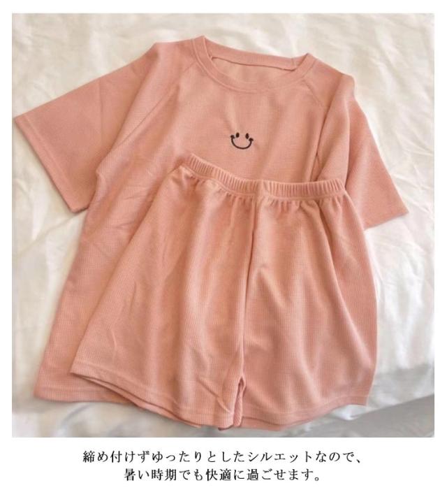 ルームウェア ワッフル 上下セット レディース セットアップ パジャマ 刺繍 夏用 Tシャツ 半袖 ショートパンツ 薄手 ワッフル生地 ナイトウェア 部屋着 半ズボン 2点セット 寝間着 リラックスウェア ゆったり かわいい ウエストゴム 大きいサイズ 女性 春 夏 送料無料