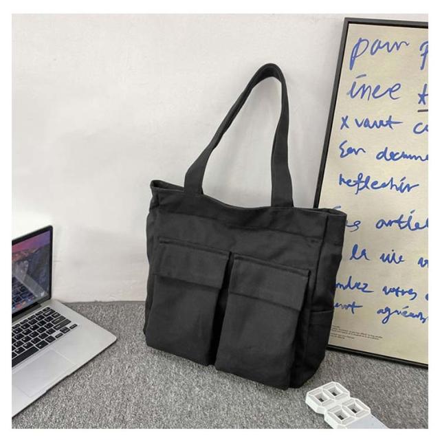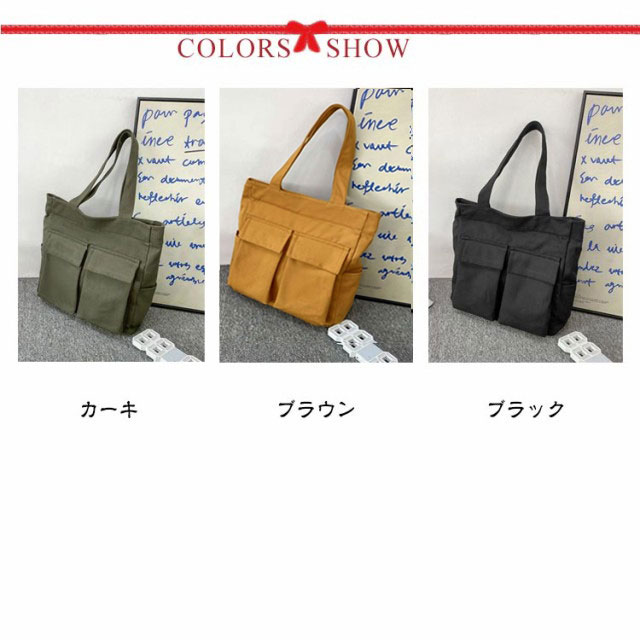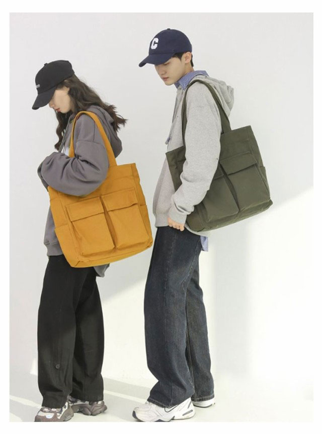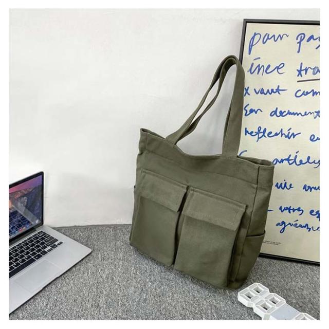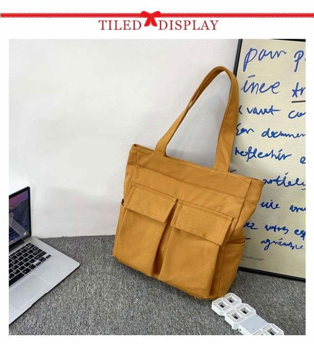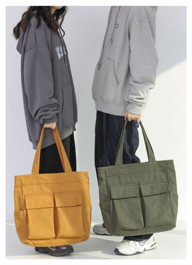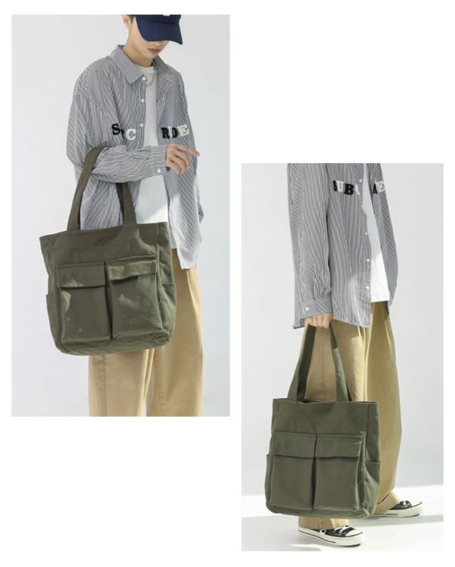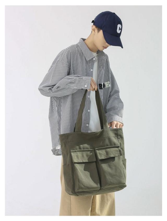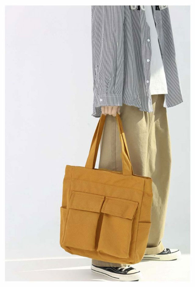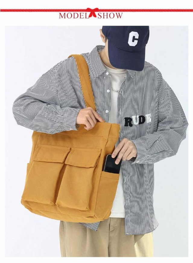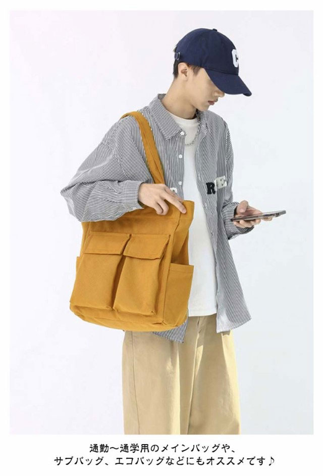 | 大人気のシンプルキャンバストートバッグ。【男女兼用】 四つの使いやすい大きめ外ポケット付き。内側にもファスナーポケットがあるので、細かい仕切りに便利です。 メイン口にはファスナーが付いているので、荷物が外に飛び出さない設計。 縦型シルエットで、A4資料やノートPCが縦に入ります。 通勤〜通学用のメインバッグや、サブバッグ、エコバッグなどにもオススメです♪ | |