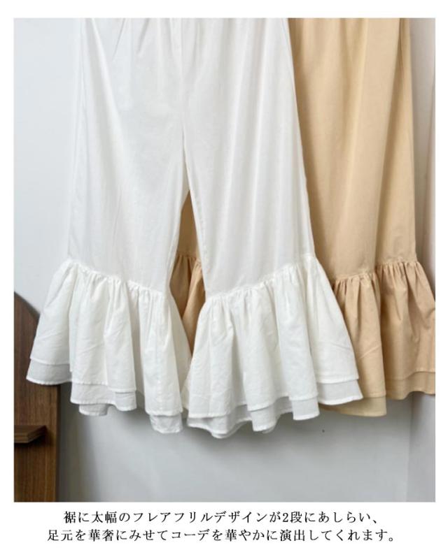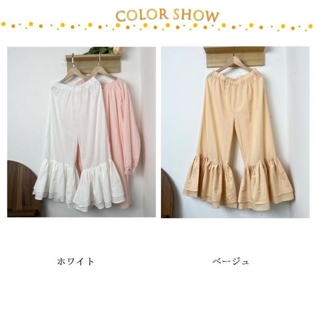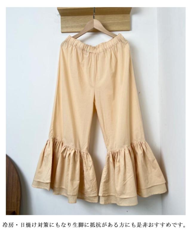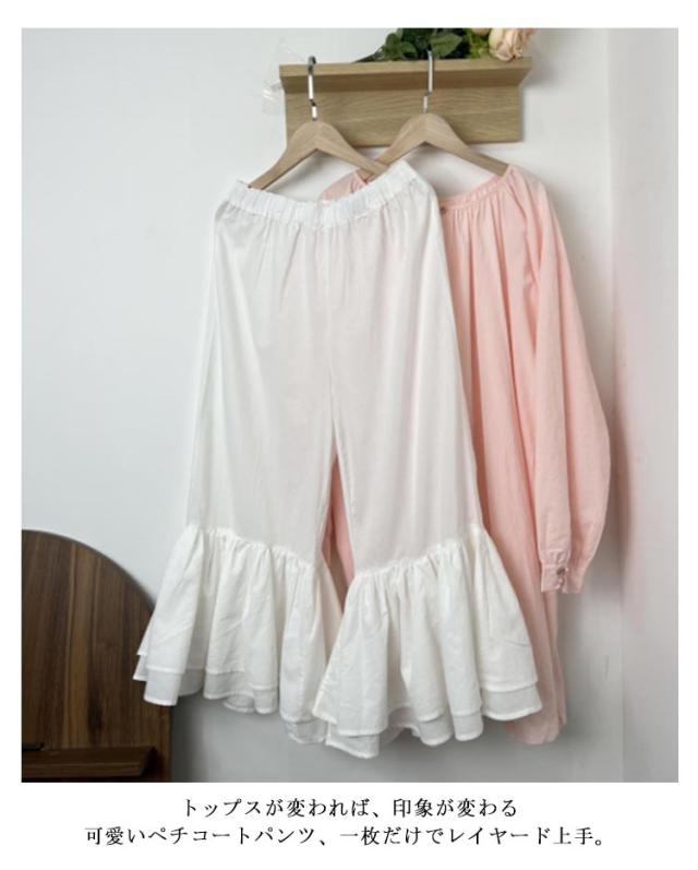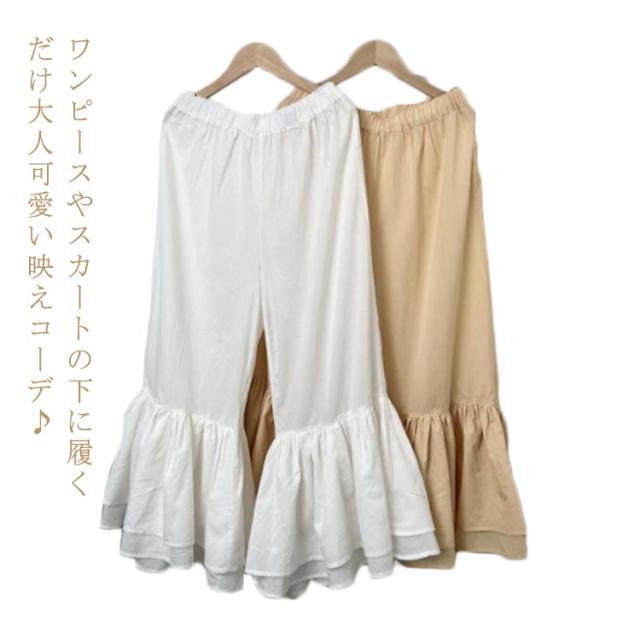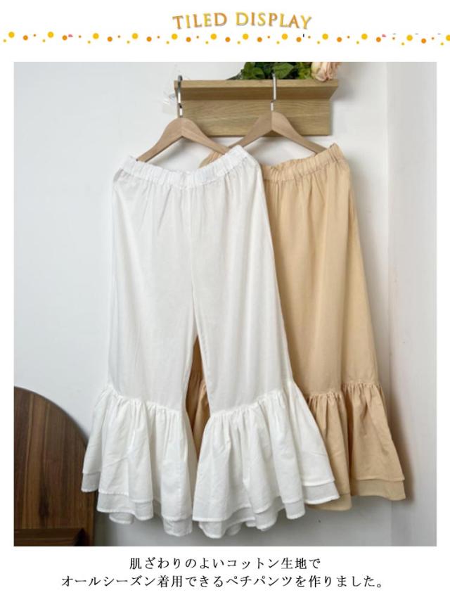 足元映え♪ 裾フリル パンツ ペチパンツ レディース パンツ ペチコート レイヤード ボトムス インナー ワイド ワイドパンツ コットン インナーパンツ 重ね着 ロング マキシ 下着 体型カバー ウエストゴム 送料無料 綿 ロングパンツ きれいめ