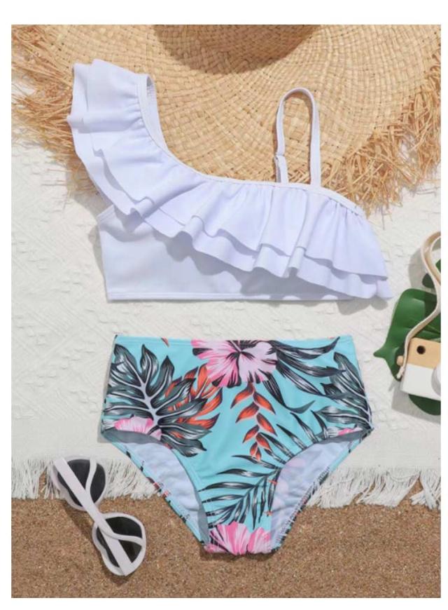 | 可愛いワンショルダーセパレート水着♪ おしゃれな大人水着のテイストを盛り込んで素敵ワンショルダーデザイン、フリフリフリルが女の子らしい可愛い水着。 無地トップスに高級感のあるボタニカル柄はリゾート感満載の上下セットスイムウェア。 バッド付きで思春期のお子様にも安心◎ | |