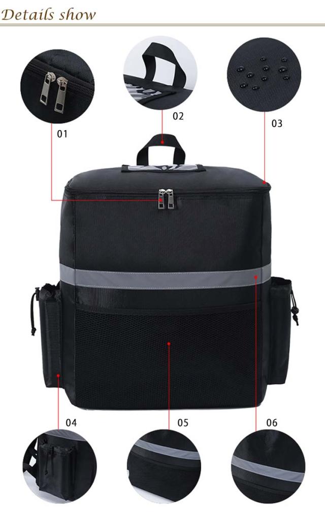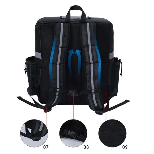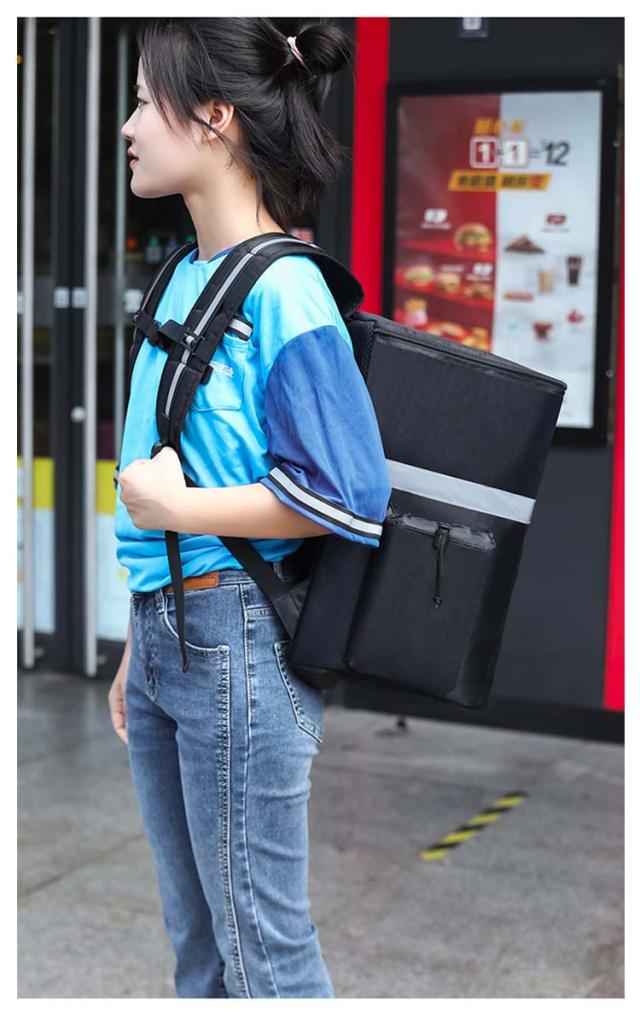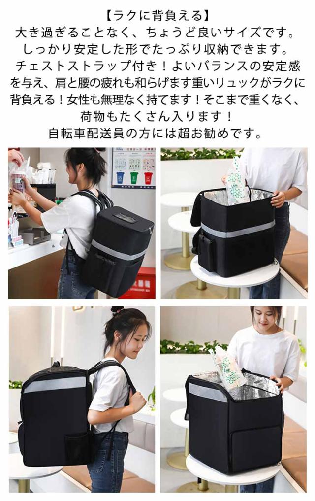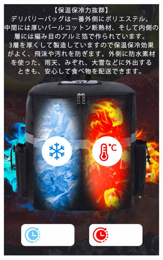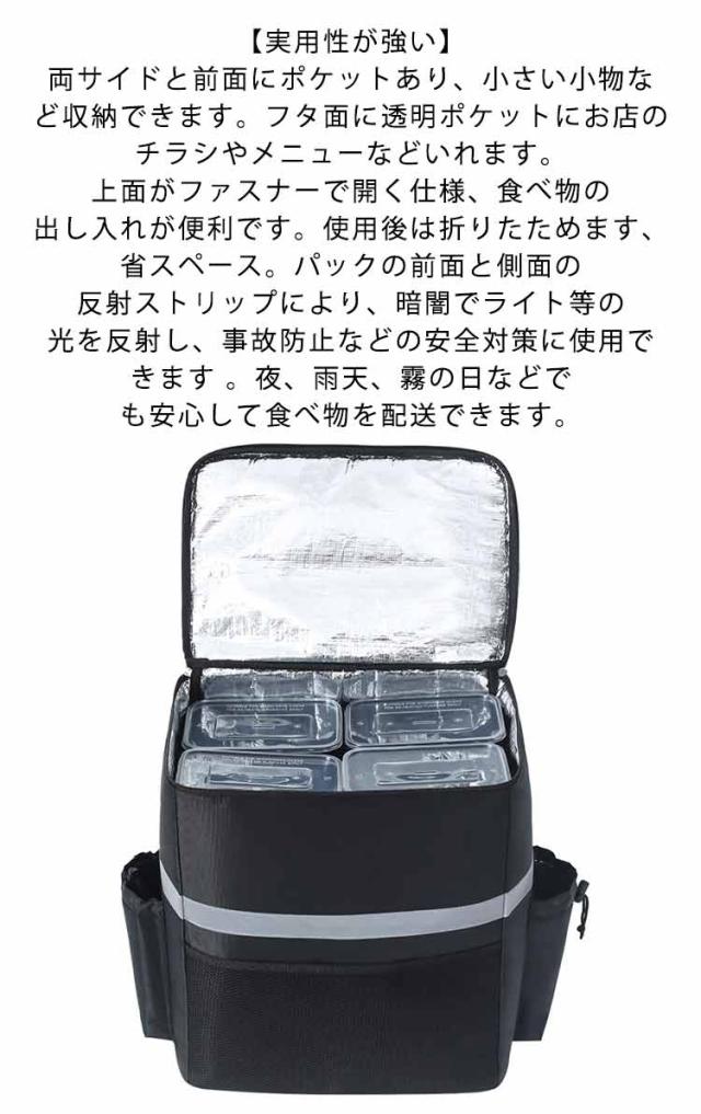 | 保温・保冷 、配達に最適なデリバリーバッグ。 【保温保冷力抜群】デリバリーバッグは一番外側にポリエステル、中間には厚いパールコットン断熱材、そして内側の層には編み目のアルミ箔で作られています。 3層を厚くして製造していますので保温保冷効果がよく、飛沫や汚れを防ぎます。外側に防水素材を使った、雨天、みぞれ、大雪などに外出するときも、安心して食べ物を配送できます。 【ラクに背負える】大き過ぎることなく、ちょうど良いサイズです。しっかり安定した形でたっぷり収納できます。 チェストストラップ付き!よいバランスの安定感を与え、肩と腰の疲れも和らげます重いリュックがラクに背負える!女性も無理なく持てます!そこまで重くなく、荷物もたくさん入ります!自転車配送員の方には超お勧めです。 【実用性が強い】両サイドと前面にポケットあり、小さい小物など収納できます。フタ面に透明ポケットにお店のチラシやメニューなどいれます。 上面がファスナーで開く仕様、食べ物の出し入れが便利です。使用後は折りたためます、省スペース。パックの前面と側面の反射ストリップにより、暗闇でライト等の光を反射し、事故防止などの安全対策に使用できます 。夜、雨天、霧の日などでも安心して食べ物を配送できます。 【42L大容量&700g軽量】大容量バックパックには、寿司、刺身、飲み物、お弁当を収納するのに十分なスペースがあります。 バッグの重さは、約700gと軽量設計なので、男女問わずお使いいただけます。また折り畳み可能で収納やすくなる。 | |