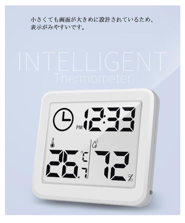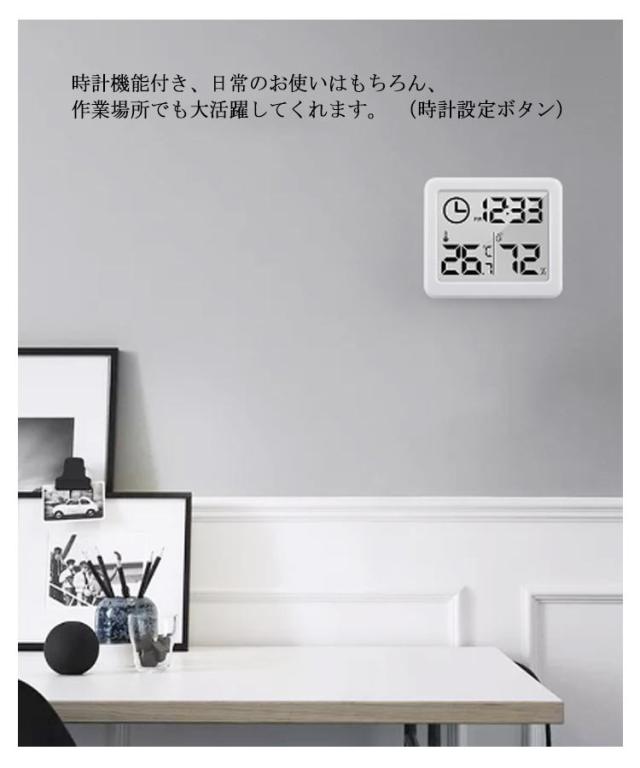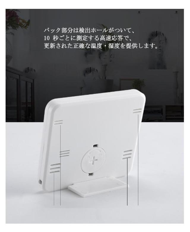 | お部屋のコンディション管理に便利なデジタル温湿度計が新登場。 小さくても画面が大きめに設計されているため、表示がみやすいです。 温湿度計は手のひらサイズなので置いても邪魔になりません。 バック部分は検出ホールがついて、10 秒ごとに測定する高速応答で、更新された正確な温度・湿度を提供します。 卓上スタンドと壁掛け用のテープが付き、卓上置きにも壁掛けにも対応できます。 時計機能付き、日常のお使いはもちろん、作業場所でも大活躍してくれます。 (時計設定ボタン) | |