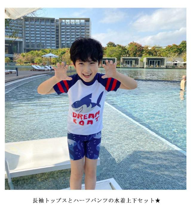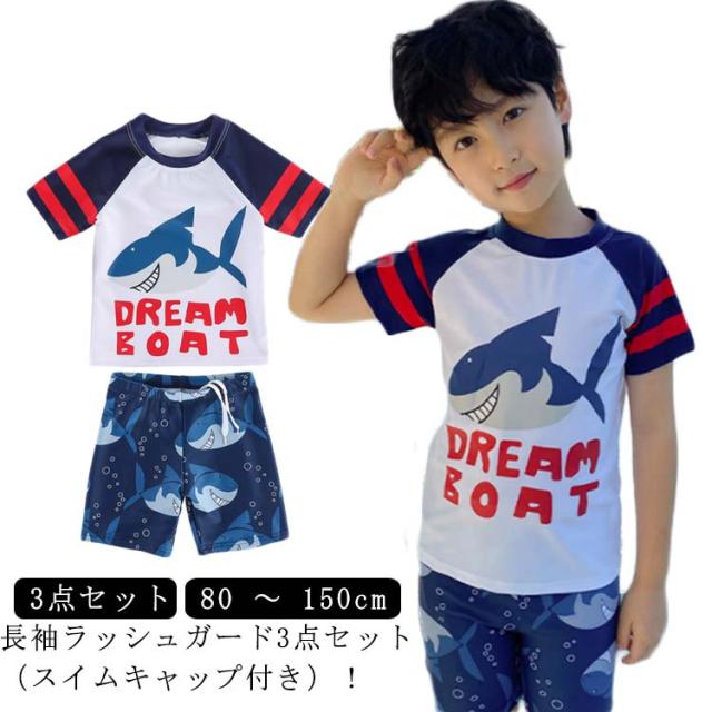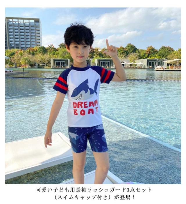 長袖 水着 子ども用 水着 スイムウェア 上下セット 3点 スイムキャップ付き ラッシュガード 送料無料 日焼け防止 SPF50 紫外線対策 幼児 幼稚園 こども服 小学生 80 90 100 110 120 130 140 150cm かわいい サメ