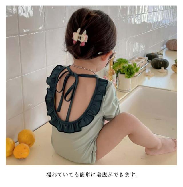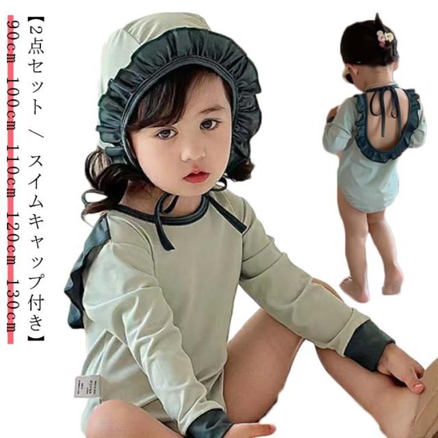 長袖 水着 キッズ 女の子 一体型 スイムキャップ付き 2点 フリル スイムウェア こども キッズ ラッシュガード 日焼け防止 UVカット SPF50 紫外線防止 幼児 幼稚園 小学生 90cm 100cm 110cm 120cm 130cm 140cm 可愛い 海 夏休み プール 砂遊び アウトドア おうちプール