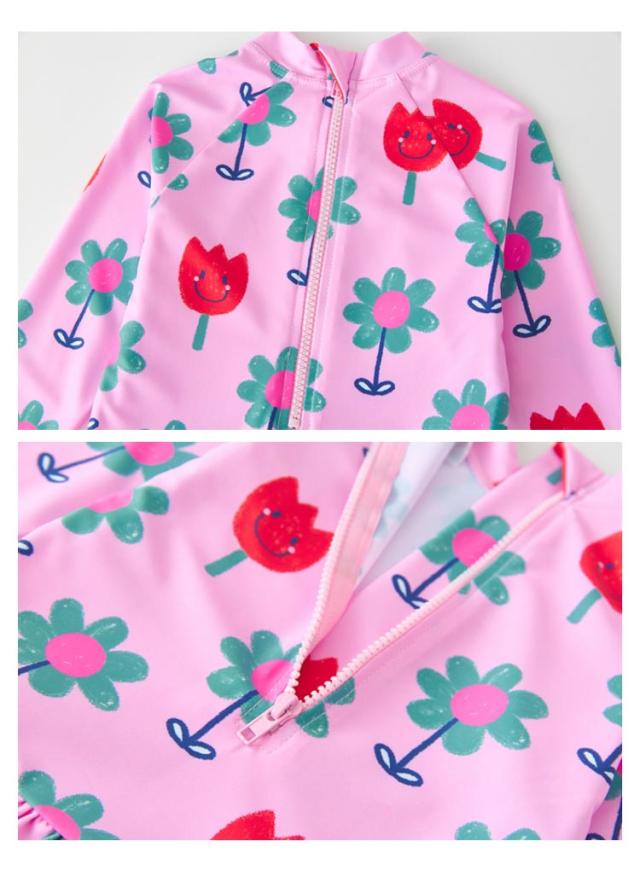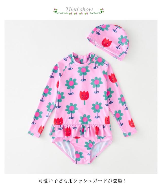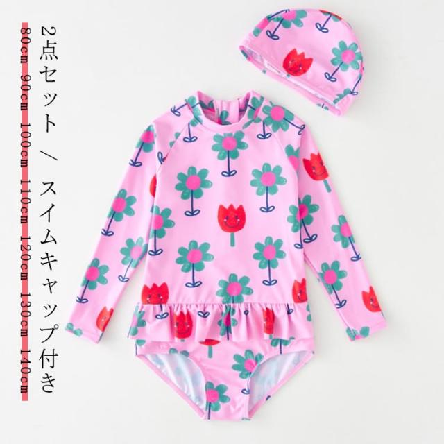 長袖 水着 キッズ 女の子 一体型 スイムキャップ付き 2点 フリル スイムウェア 花柄 総柄 こども キッズ ラッシュガード 日焼け防止 UVカット SPF50 紫外線防止 幼児 幼稚園 小学生 90cm 100cm 110cm 120cm 130cm 可愛い 海 夏休み プール 砂遊び アウトドア おうちプール