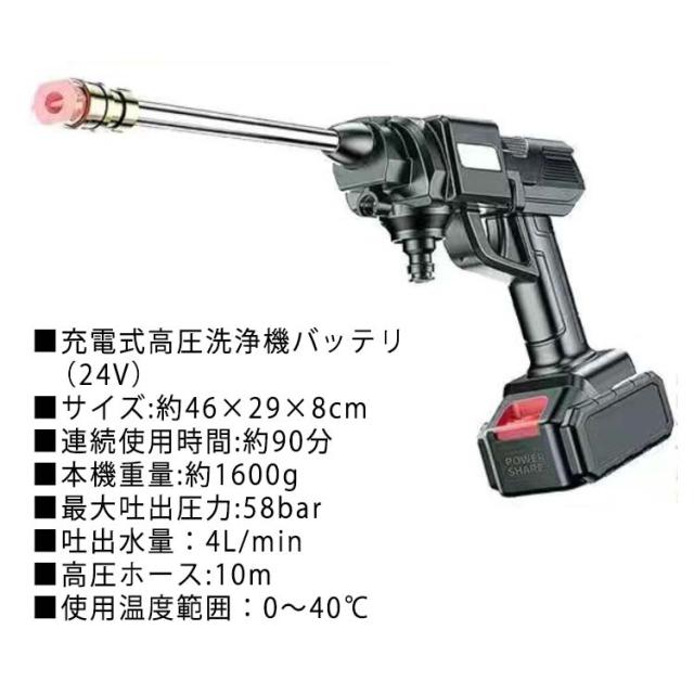 | 充電式高圧洗浄機、ガンと本体が一体化した使い勝手の良い多機能ハンディウォッシャー コードレス(充電式)・専用タンク不要なので、ベランダや屋外などいつでもどこでも使用可能。 無段階回転ノズルついた拡散可変ランスは直噴・拡散・シャワーの3つの水流を生み出します。 軽量デザインで、女性がスマートに使えるコンパクトな洗浄機。 使い方は簡単、初心者でもすぐできます。 収納ケース付きで、収納もジャストサイズで収められます。 ■充電式高圧洗浄機バッテリ(24V) ■サイズ:約46×29×8cm ■連続使用時間:約90分 ■本機重量:約1600g ■最大吐出圧力:58bar ■吐出水量:4L/min ■高圧ホース:10m ■使用温度範囲:0〜40℃ | |