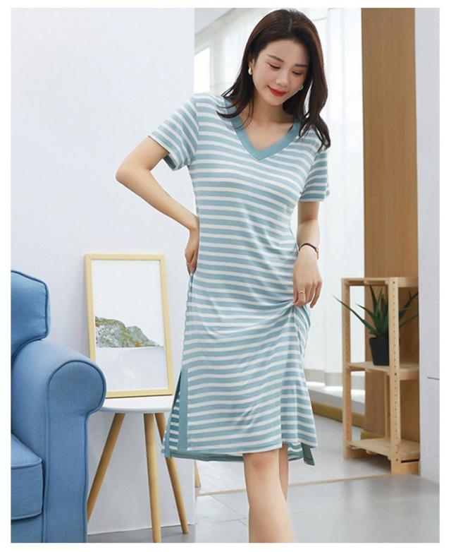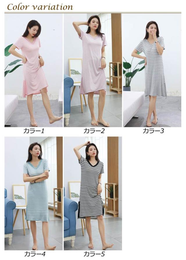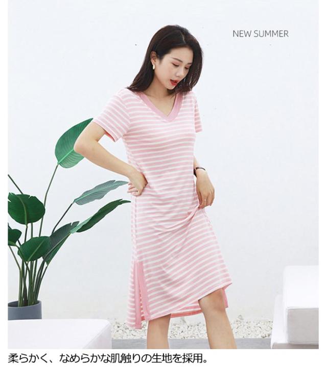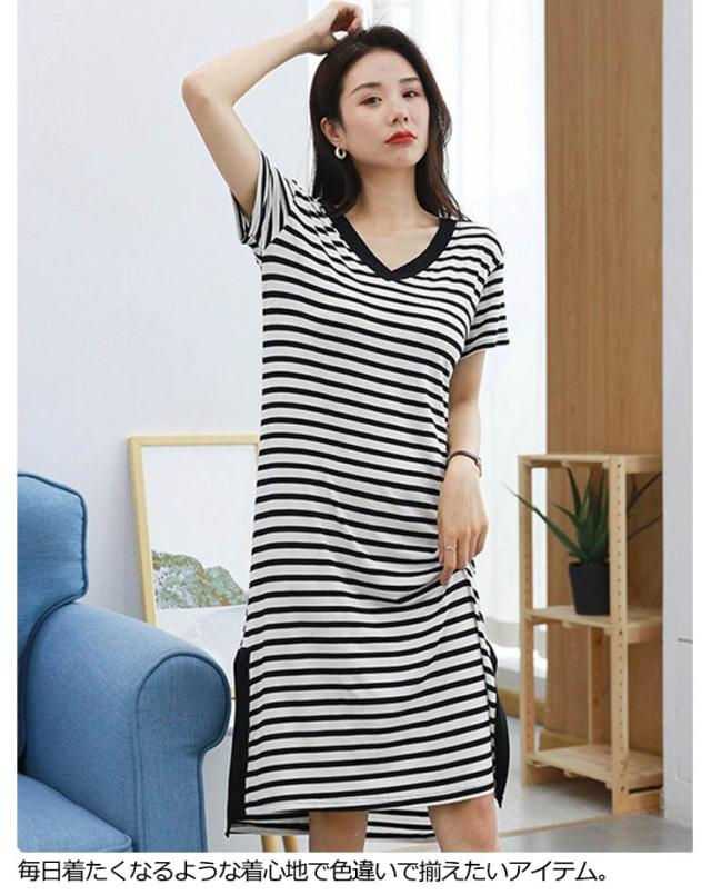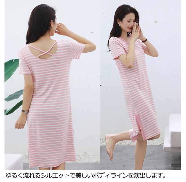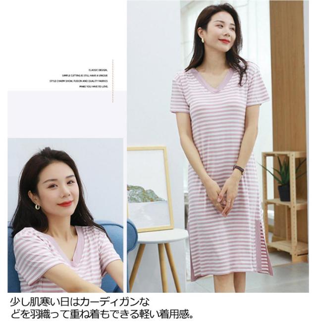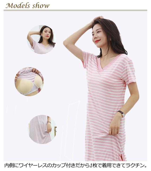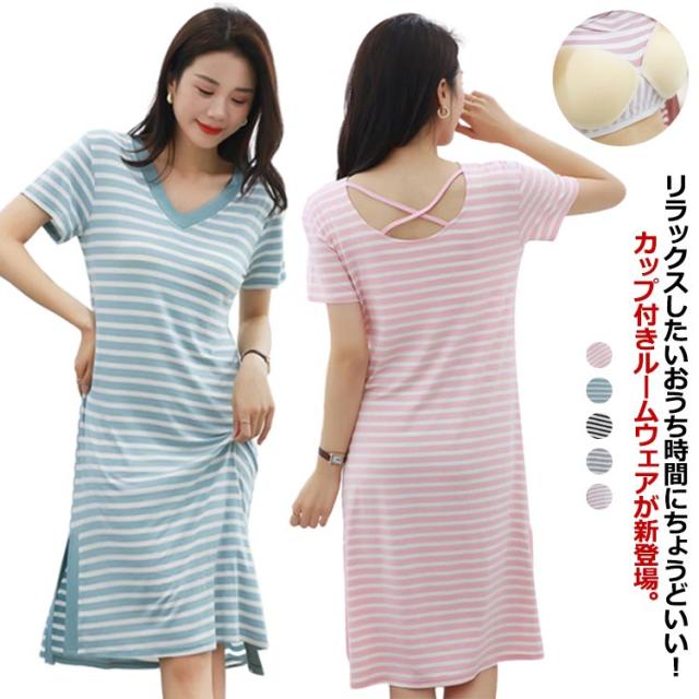 カップ付き 夏 ルームワンピース 半袖 パジャマ レディース ルームウエア 部屋着 ワンピース 膝下丈 ボーダー柄 Vネック リラックスウエア ゆったり 体型カバー シンプル インナー モダール 在宅 寝間着 ナイトウェア 大きサイズ 無地 おしゃれ 春夏 送料無料