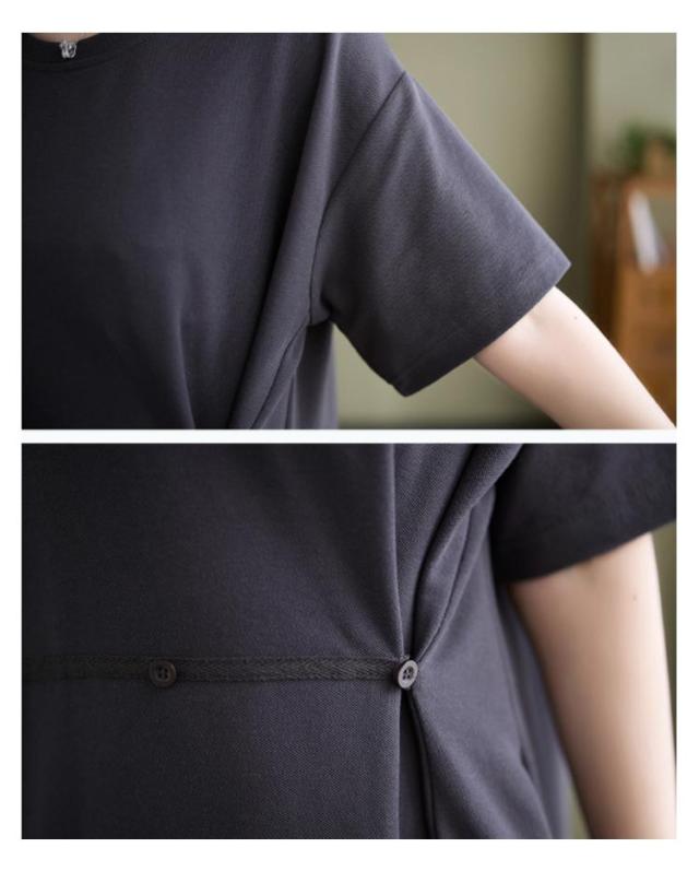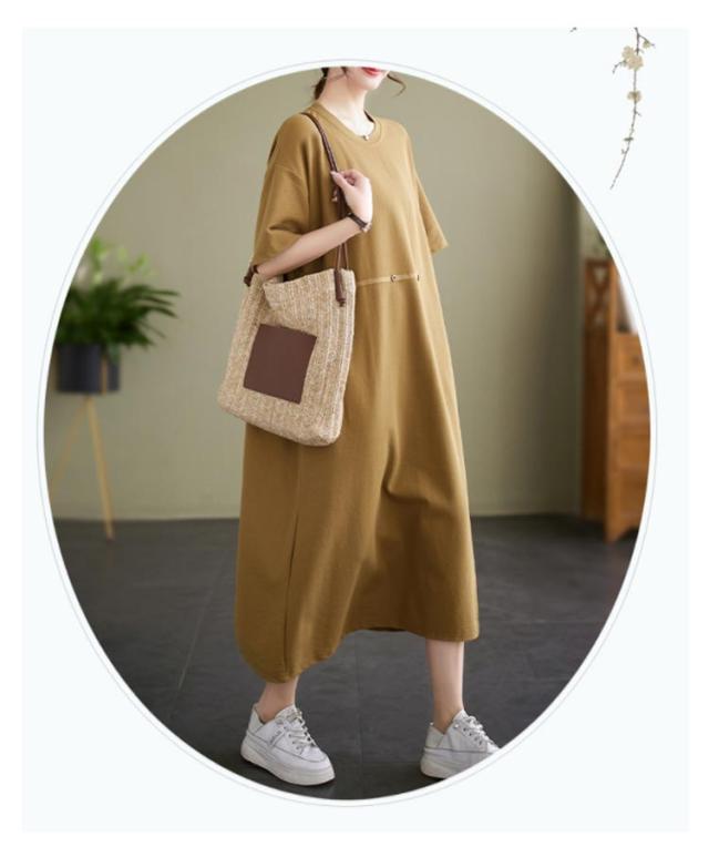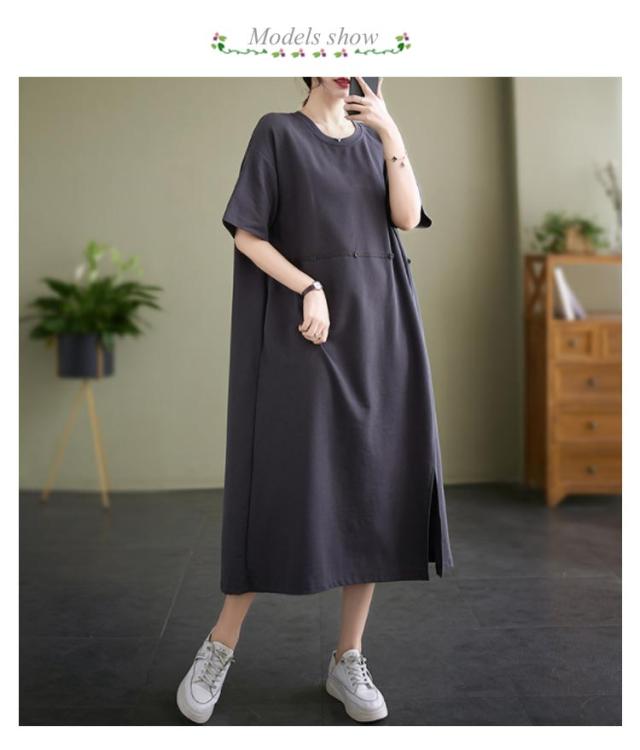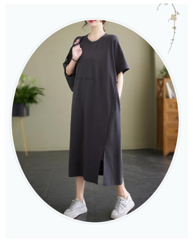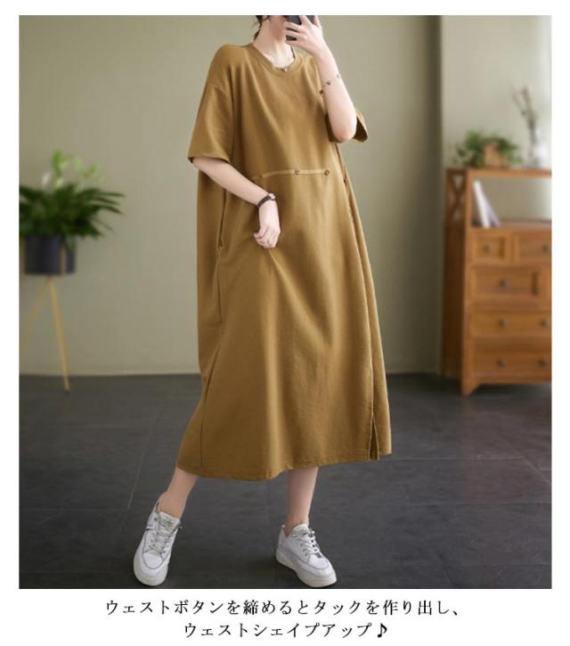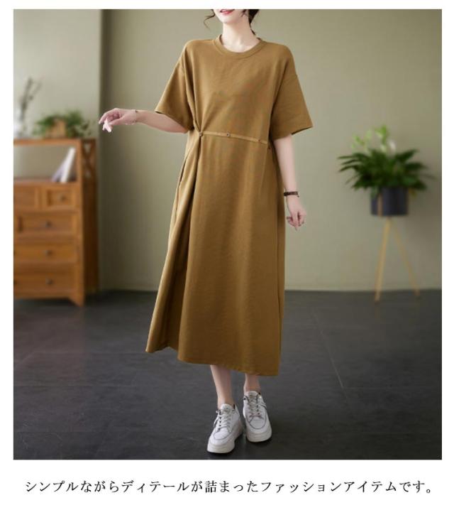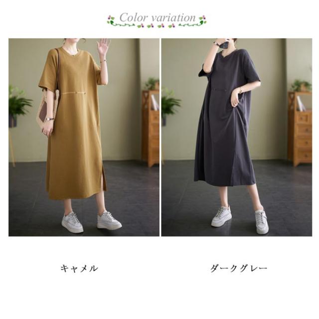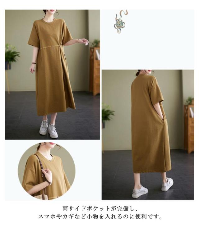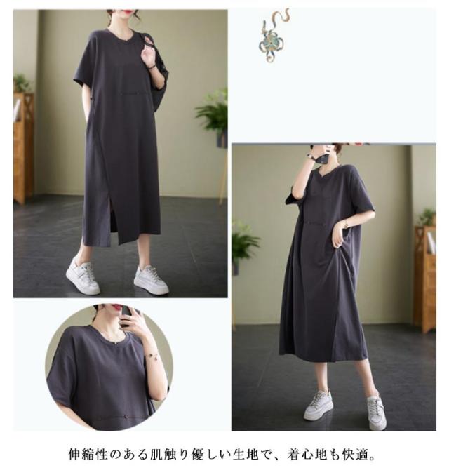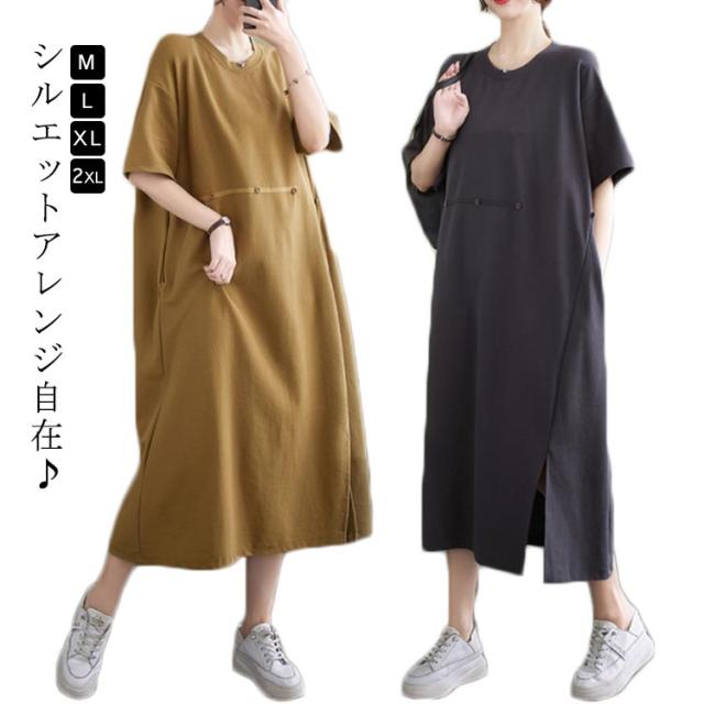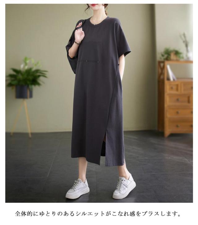 Tシャツワンピース 半袖 ロングワンピース レディース カットソー ワンピース 無地 マキシ丈 ミモレワンピース 大きいサイズ ゆったり ロングワンピ ビッグシルエット キレイめ 体型カバー ポケット付き スリット入り