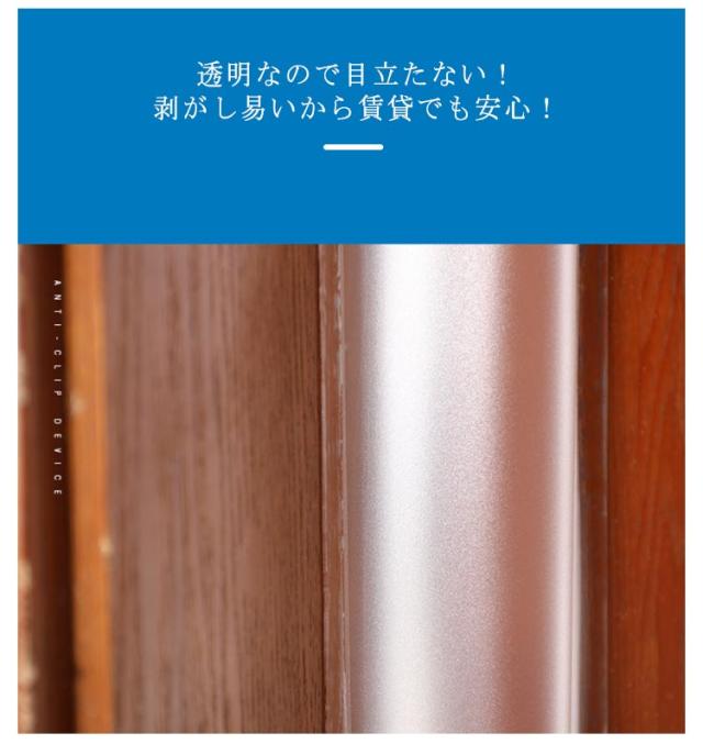 | 指はさみ防止対策・貼るだけ取付簡単 ドアへの指はさみ事故を防止するゆびストッパー 取り付けも簡単で、専用の両面テープで貼り付けるだけ。 透明なので目立たない! 剥がし易いから賃貸でも安心! ご家庭だけではなく、公共の場所での安全対策にも! 保育園や幼稚園、公民館、小児科、育児センターなど、お子様の出入りが多い場所での思わぬ事故リスクを軽減します! 【使用方法】 1、取り付けるドアを全開の状態で、片方の剥離紙をはがし、柱側に強く接着する。 2、次にもう片方の剥離紙をはがし、ドア側に強く接着する。 | |