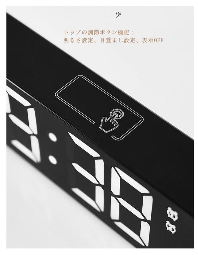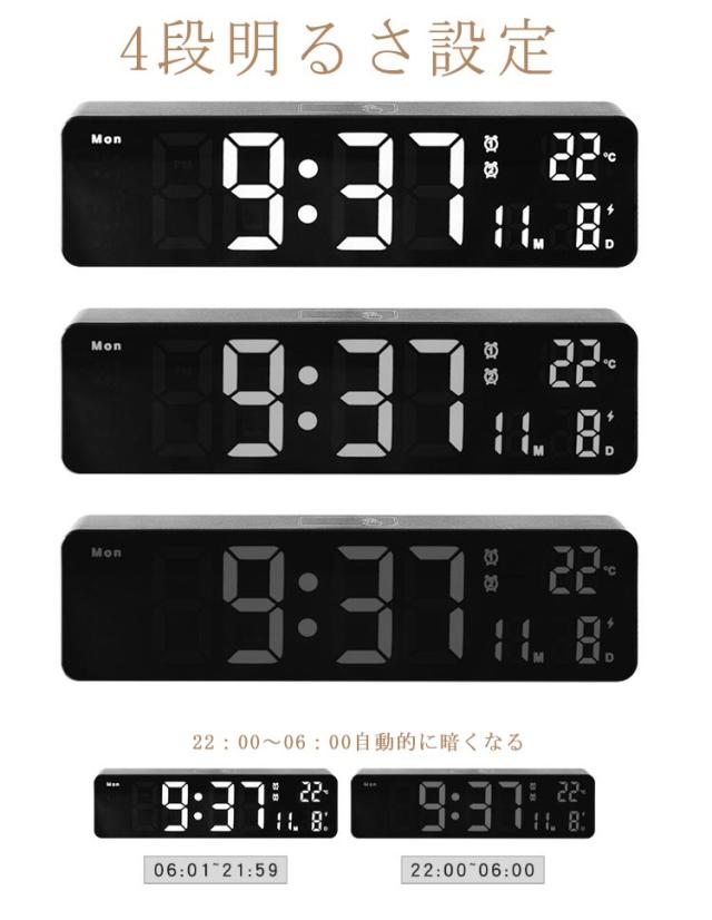 | 【 2way 大型時計&掛け置き両用 】 【 多機能LED目覚まし時計 】 【 明るさ4段階 調節可能 】 超大型で遠くからでもはっきり見えます。掛け置き両用、家/オフィス/公共の場のための普遍的なデジタル時計。 日付/曜日表示 温度表示 12/24時間制 華氏温度?/摂氏温度℃表示 タイマー スヌーズ タイムメモリー機能 明るさ調整 簡単なワンタッチ式操作 用途に応じて明るさを調整でき、4段階調光機能付きです。壁掛け時計の背面下部には自動調光ボタンがあり、真ん中を押すと、環境に応じて明るさを自動調整します。 | |