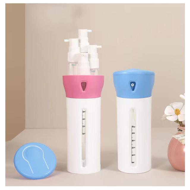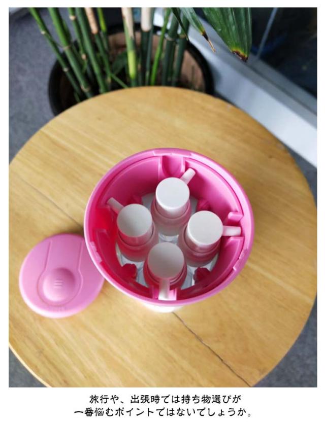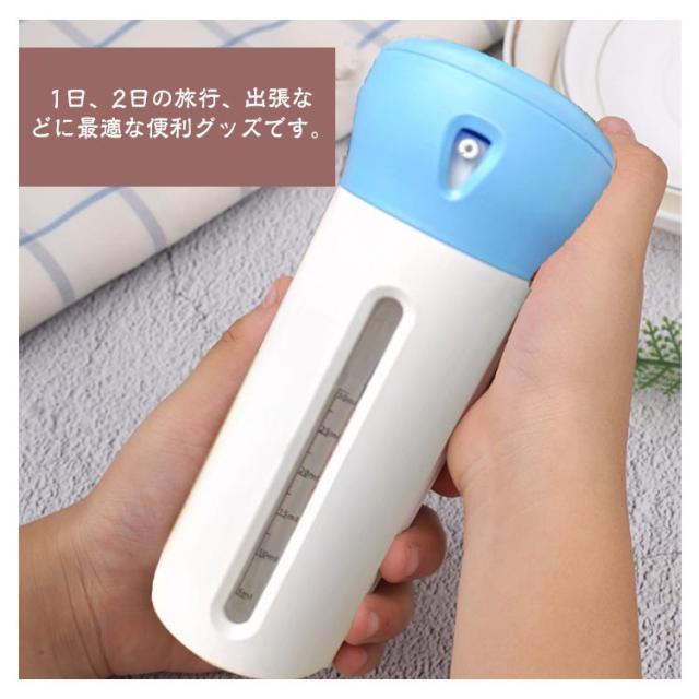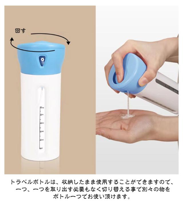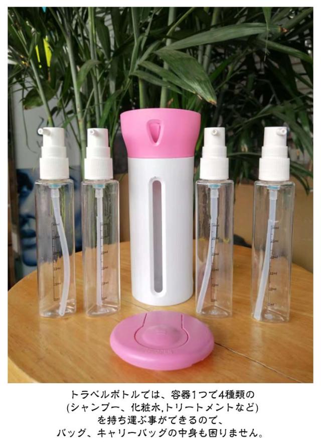 | 【お得な2個セット!】 【ボトル一つで、四種類の液体を収納できる。】 【収納したまま、使用も可能。】 【収納物の内容量が一目でわかるデザイン。】 【ボトル一つで、四種類の液体を収納できる。】 旅行や、出張時では持ち物選びが一番悩むポイントではないでしょうか。 トラベルボトルでは、容器1つで4種類の(シャンプー、化粧水,トリートメントなど) を持ち運ぶ事ができるので、バッグ、キャリーバッグの中身も困りません。 1日、2日の旅行、出張などに最適な便利グッズです。 【収納したまま、使用も可能。】 トラベルボトルは、収納したまま使用することができますので、 一つ、一つを取り出す必要もなく切り替える事で別々の物を ボトル一つでお使い頂けます。 【収納物の内容量が一目でわかるデザイン。】 内部ボトルの容量が一目でわかるデザインとなっているので、 容量を足したり、入れ替えを行うなどスムーズに行う事ができます。 | |