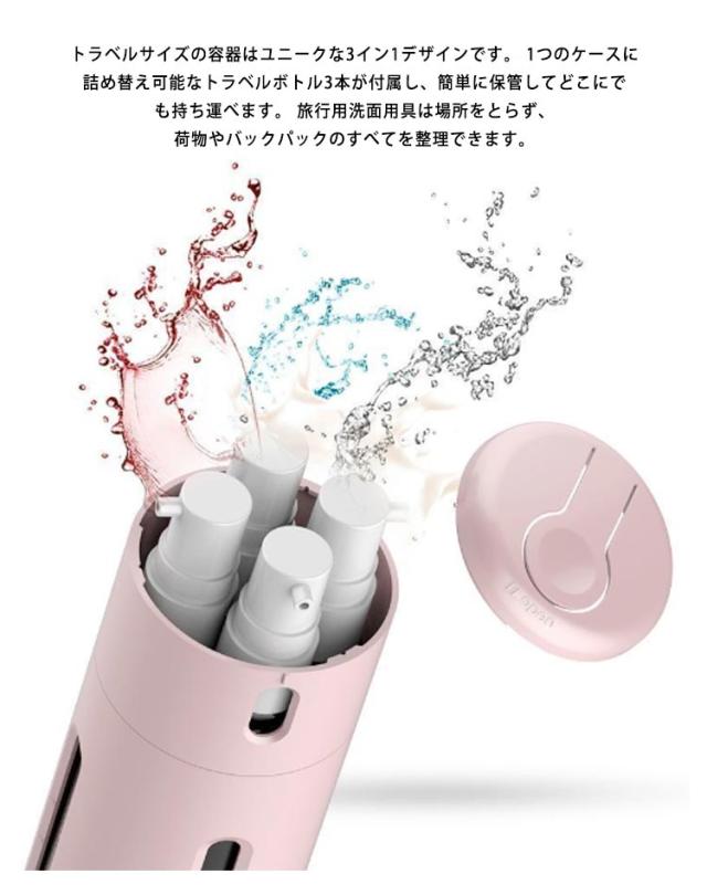 | 【使用前の注意事項】1.小瓶の蓋をしっかり締めてください。2.トラベルボトルの蓋を回転させるときは、蓋を下に押さないでください。 3.回転が完了したことを確認するために、トラベルボトルの蓋を回転させるときに音が鳴ることがありますが、正常です。 【3イン1デザイン】トラベルサイズの容器はユニークな3イン1デザインです。 1つのケースに詰め替え可能なトラベルボトル3本が付属し、簡単に保管してどこにでも持ち運べます。 旅行用洗面用具は場所をとらず、荷物やバックパックのすべてを整理できます。 【キュートなデザイン&使いやすい】コスメティックトラベルボトルは軽量でキュートなデザインで、中身を補充し出しやすく、とても便利です。 液体ボトルを取り外す必要はありません。蓋を回して異なるディスペンサーに切り替え、上部のボタンを押して液体を噴射してください。 【ギフトに最適】様々な状況、飛行機、旅行、出張、キャンプに最適です。家族、友人、パートナー、旅行愛好家、出張中の上司への最高の旅行ギフトセット。 | |