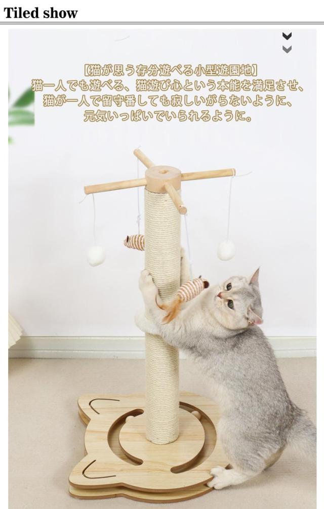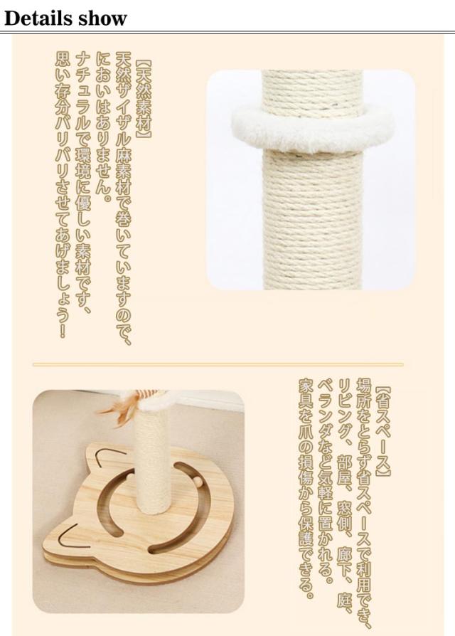 | 【天然サイザル麻・木製】【高さ64cm】【おもちゃ付き】【耐久性抜群】 【猫が思う存分遊べる小型遊園地】猫一人でも遊べる、猫遊び心という本能を満足させ、猫が一人で留守番しても寂しいがらないように、元気いっぱいでいられるように。 【省スペース】場所をとらず省スペースで利用でき、リビング、部屋、窓側、廊下、庭、ベランダなど気軽に置かれる。家具を爪の損傷から保護できる。 【安定性抜群】本製品は広くて頑丈な台座で支えていて、安定性抜群です。 【ストレス解消】両手で抱きかかえるようにすることで、より強い力で爪を研ぐことができるため、ストレス解消にも効果的です。 【天然素材】天然ザイザル麻素材で巻いていますので、においはありません。ナチュラルで環境に優しい素材です、思い存分バリバリさせてあげましょう! 【猫のおもちゃ】上部と下部にもおもちゃが付いております、遊んでいるうちにストレス解消できます!爪とぎの快適と遊ぶ楽しみで猫ちゃんの気分を高めよう。 【極太ポール爪とぎ】太いのしっかりした爪とぎなので、両手でガッシリ掴んで思う存分爪とぎしてもらえます。 【部屋に馴染みやすい色】原木色だから、部屋の配色にも馴染みやすい。サイザル麻の色も簡単でシンプル、様々なインテリアに似合う。 | |